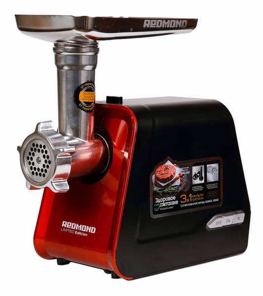 Redmond RMG-1250 отличается компактным размером и небольшим весом. При этом мясорубка оснащена всем необходимым для использования ее возможностей по максимуму: три перфорированных диска для изготовления фарша разной степени измельчения (с диаметром отверстий в 7, 5 и 3 мм), насадки для изготовления колбас и кеббе. Встроенный в корпус прибора отсек для аксессуаров сделает удобным хранение и позволит не потерять в кухонных шкафах решетки и насадки.