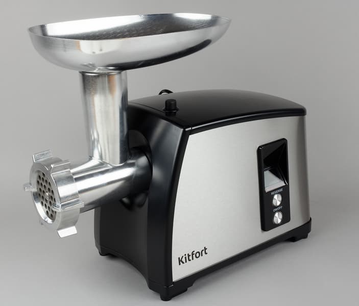 Kitfort KT-2104, как и некоторые упомянутые выше устройства — многофункциональный прибор. Она приятно выглядит и оснащена богатым набором аксессуаров. Помимо мясорубки с тремя решетками, это еще и овощерезка, электротерка и устройство для набивки колбас и кеббе. Диаметр отверстий на дисках соответствует значениям в 3, 5 и 7 мм.