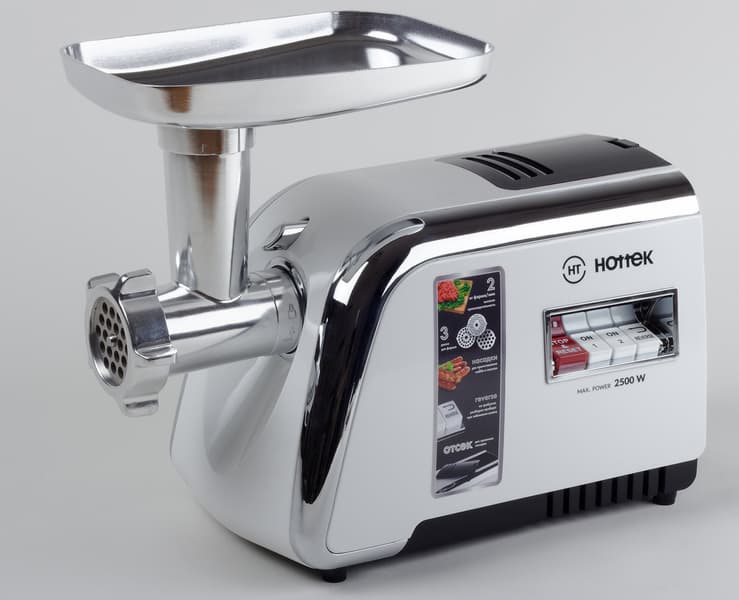 Hottek HT-976-005 умеет делать фарш разной степени измельчения из разных продуктов, а из мясного фарша — кеббе и колбаски. Кроме того, мясорубка достаточно мощная, насадки и толкатель можно хранить прямо в корпусе.