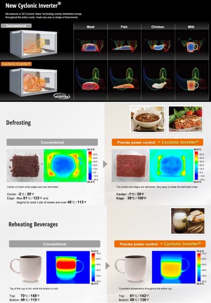 Частично решить эти проблемы призвана инверторная печь. Ее основное отличие от традиционной микроволновки заключается в наличии специального электронного блока управления мощностью магнетрона (инвертора). Благодаря такому устройству микроволновка получает способность работать не только дискретно (вкл./выкл.), но также на произвольно установленной мощности с равномерным нагревом продукта.