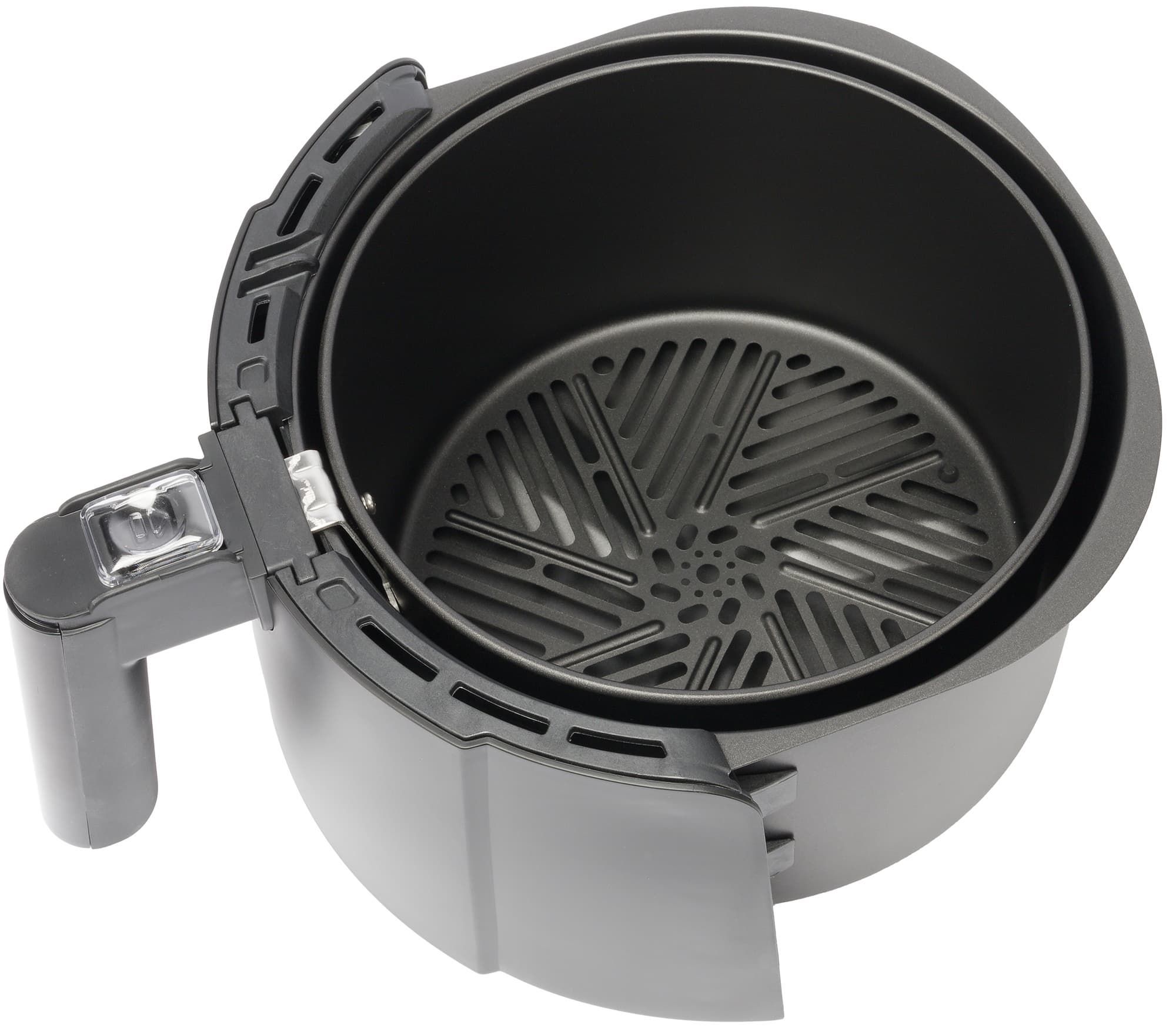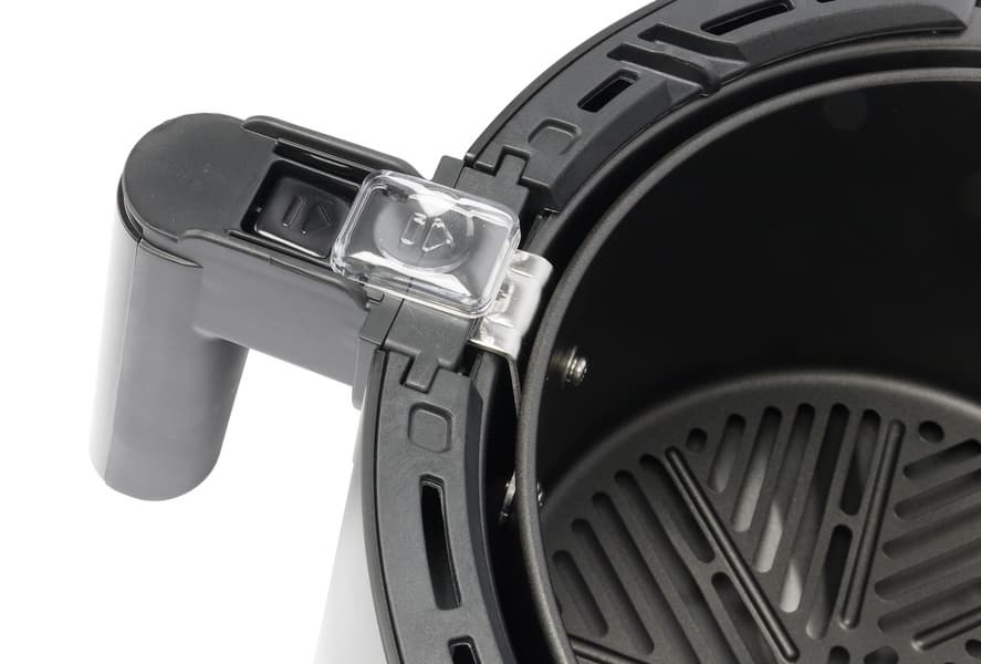 На ручке расположен предохранительный механизм из прозрачного пластика, закрывающий собой кнопку отсоединения контейнера с решеткой от поддона. Если пластиковый предохранитель подвинуть вперед, то можно будет легко нажать кнопку и вынуть одну емкость из другой. А если предохранитель сдвинут назад, то кнопка не нажмется даже случайно. Чтобы закрепить решетку внутри поддона, также потребуется нажать на кнопку, иначе крепление не войдет в пазы.