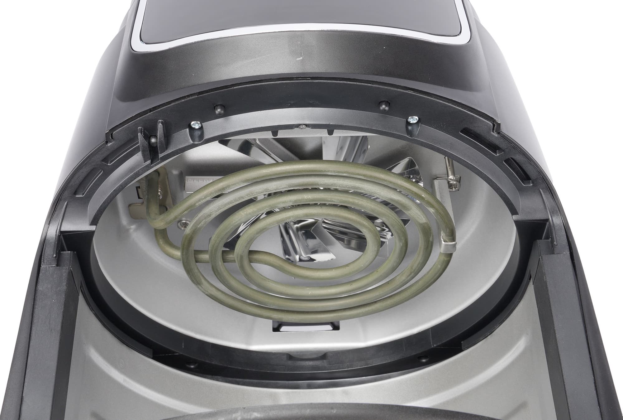Если вынуть чашу с контейнером из корпуса аэрогриля, то можно заглянуть внутрь и увидеть нагревательную спираль. За ней находится большой стальной вентилятор с достаточно широкими лопастями. С одной стороны находится разъем с решеткой для выхода горячего воздуха, с противоположной стороны расположен датчик термостата.