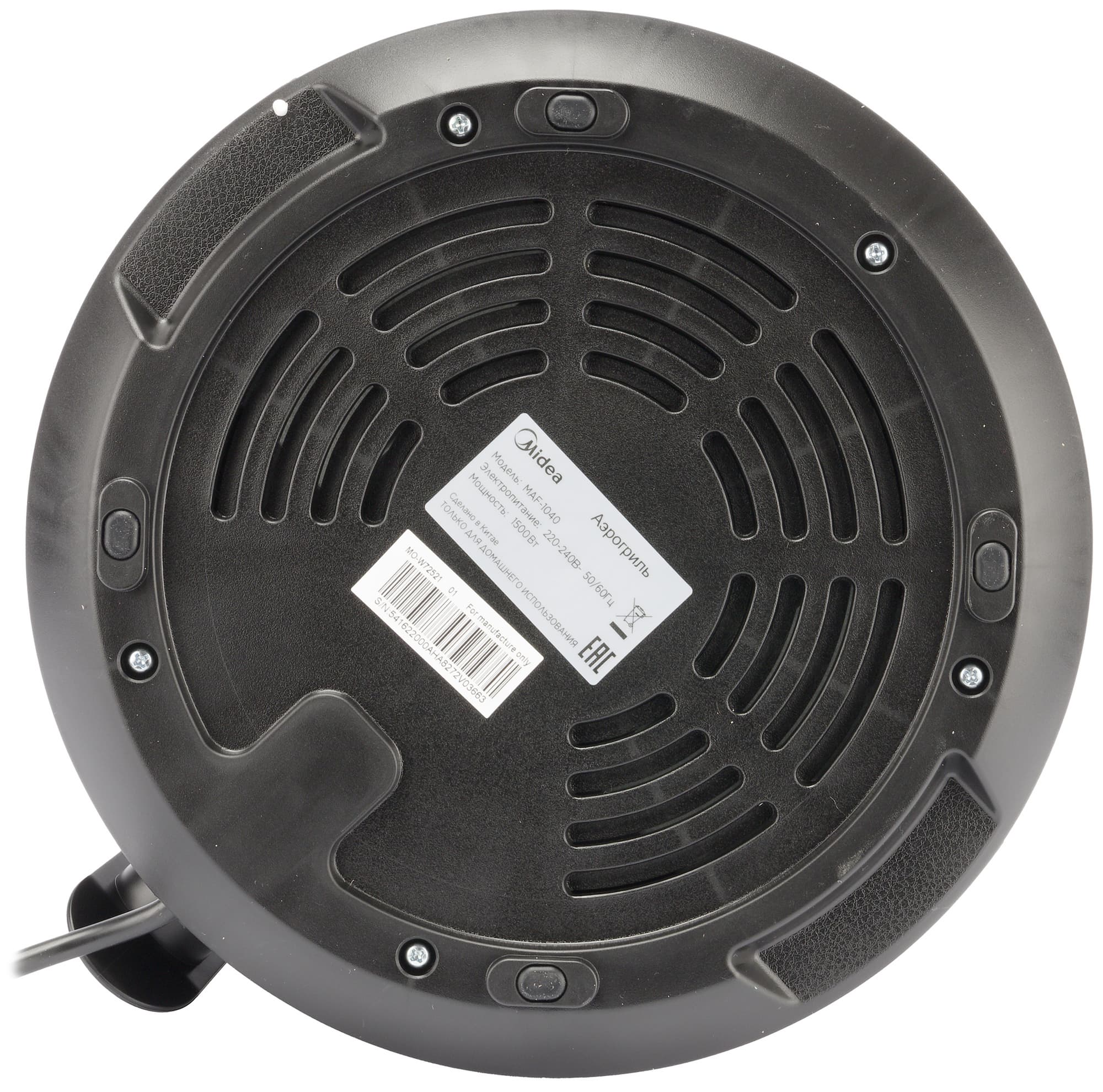 На дне аэрогриля расположены четыре прорезиненные ножки. Между ножек спереди полукругами расположены вентиляционные отверстия. Посередине наклеен небольшой шильдик с техническими характеристиками прибора и информацией о производителе, а ниже отдельной наклейкой — штрихкод.