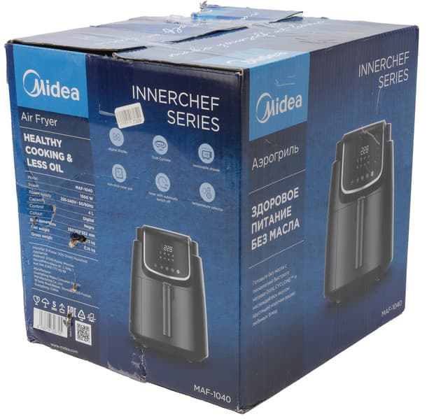 Сегодня у нас на тесте аэрогриль Midea MAF-1040. Внешне прибор выглядит достаточно привычно для аэрогриля, но всё еще куда интереснее, чем микроволновка или духовка. Устройство обещает заменить собой три кухонных прибора (гриль, фритюрница, духовка) и предлагает готовить блюда либо совсем без масла, либо с минимальным количеством. Объем чаши небольшой, 4 литра, зато есть восемь автопрограмм — для регулярного использования этого обычно хватает. Давайте проверим, так ли это на практике.