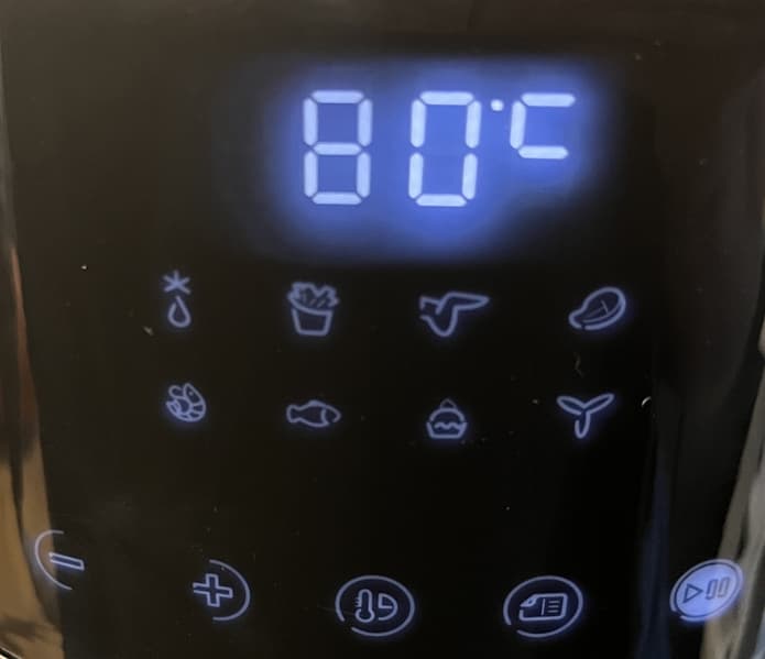 Нажатие на кнопку включения вновь подсвечивает все 5 нижних кнопок и 8 иконок автопрограмм. На дисплее высвечивается температура 80 °C для быстрого запуска по умолчанию.