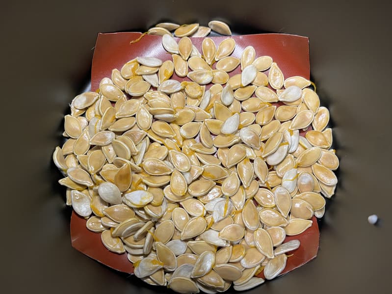 Для этого промыли семена, отделили их от прожилок, просушили бумажным полотенцем, выложили на силиконовый коврик в чашу аэрогриля и отправили подсушиваться в течение трех часов при температуре 60 градусов.