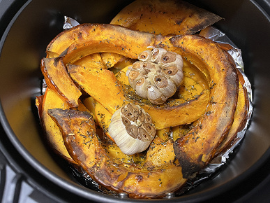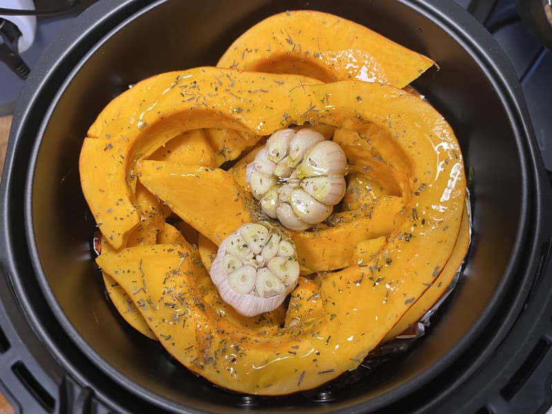 Порезанную тыкву уложили в чашу, добавили к ней две головки чеснока, орегано, соль и растительное масло.