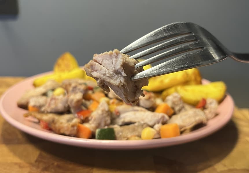 Чтобы проверить, насколько хорошо в аэрогриле прожарится большое количество мяса, мы решили приготовить в нем свинину с овощами.