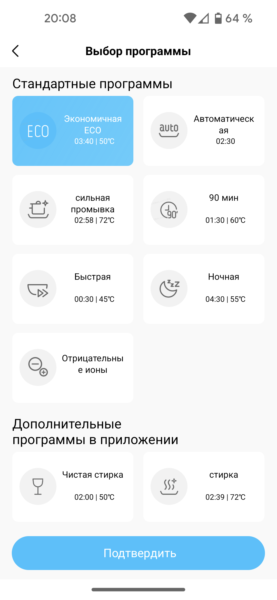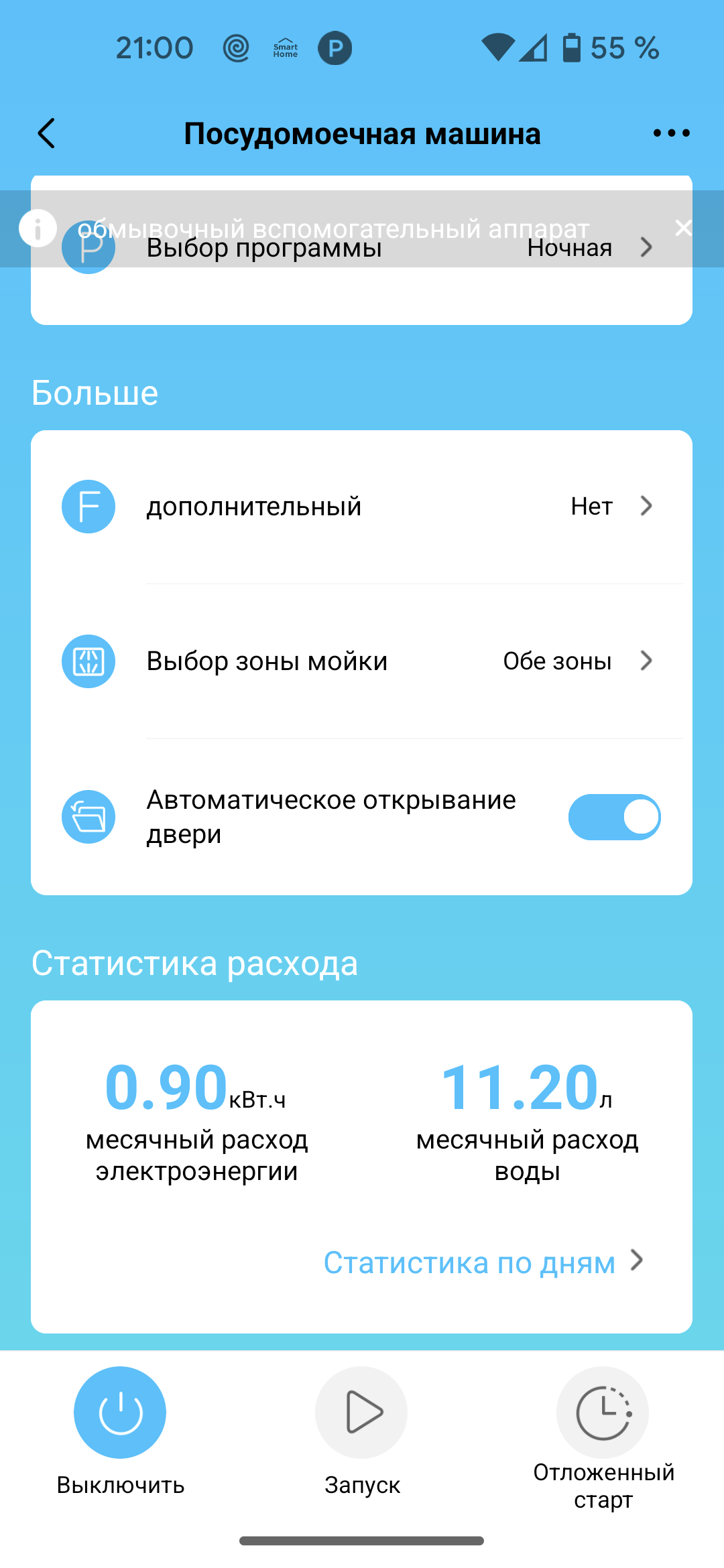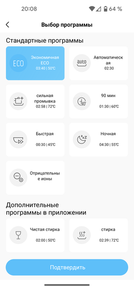 При выборе программы в приложении пользователь может воспользоваться всеми дополнительными опциями, доступными с панели управления. А вот выбрать зону мойки (оба распылителя, только верхний или только нижний) можно исключительно в приложении.