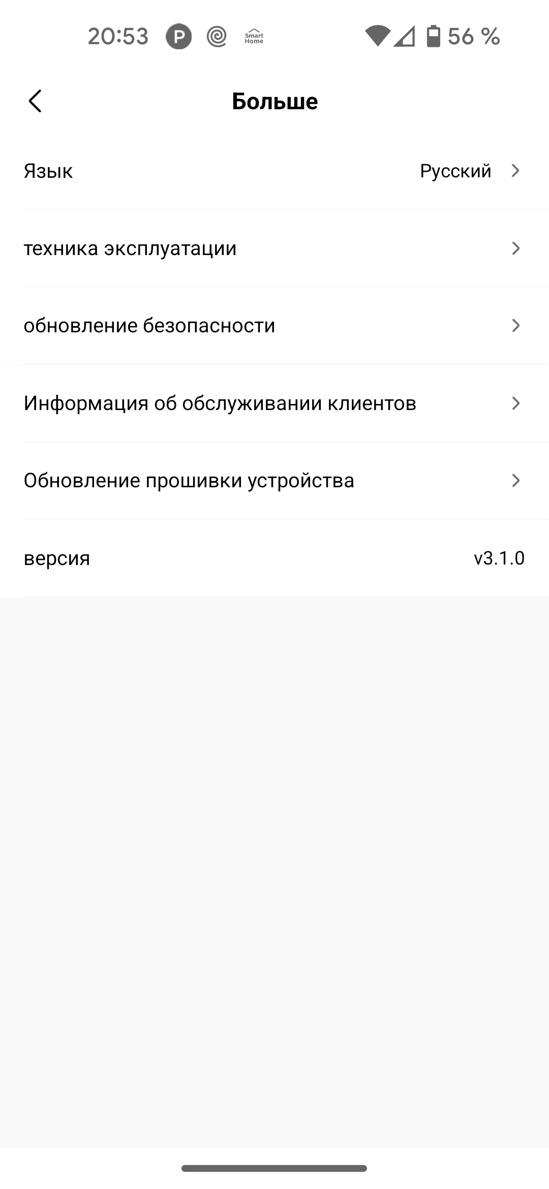 В разделе настроек можно изменить язык приложения, уточнить версию встроенного ПО и обновить его, узнать телефон службы технической поддержки и ознакомиться с электронной документацией.