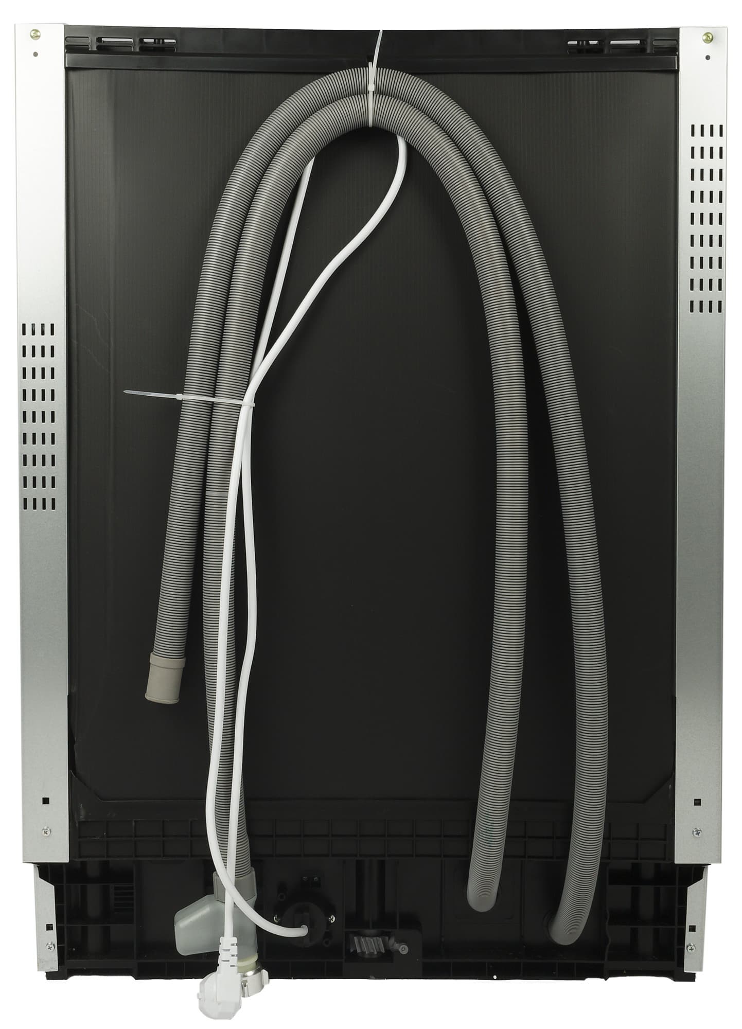 В нижней части задней стенки из корпуса выходят гофрированные шланги: заливной, снабженный клапаном AquaStop, и сливной. Рядом с ними — выход электропровода.