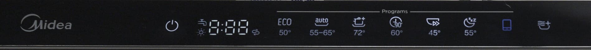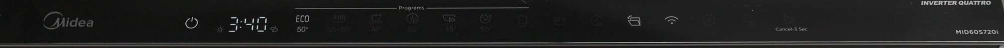 Как и у всех аналогичных встраиваемых приборов, панель управления Midea MID60S720i размещена на верхней кромке дверцы. Когда машина закрыта, панель скрыта под столешницей.