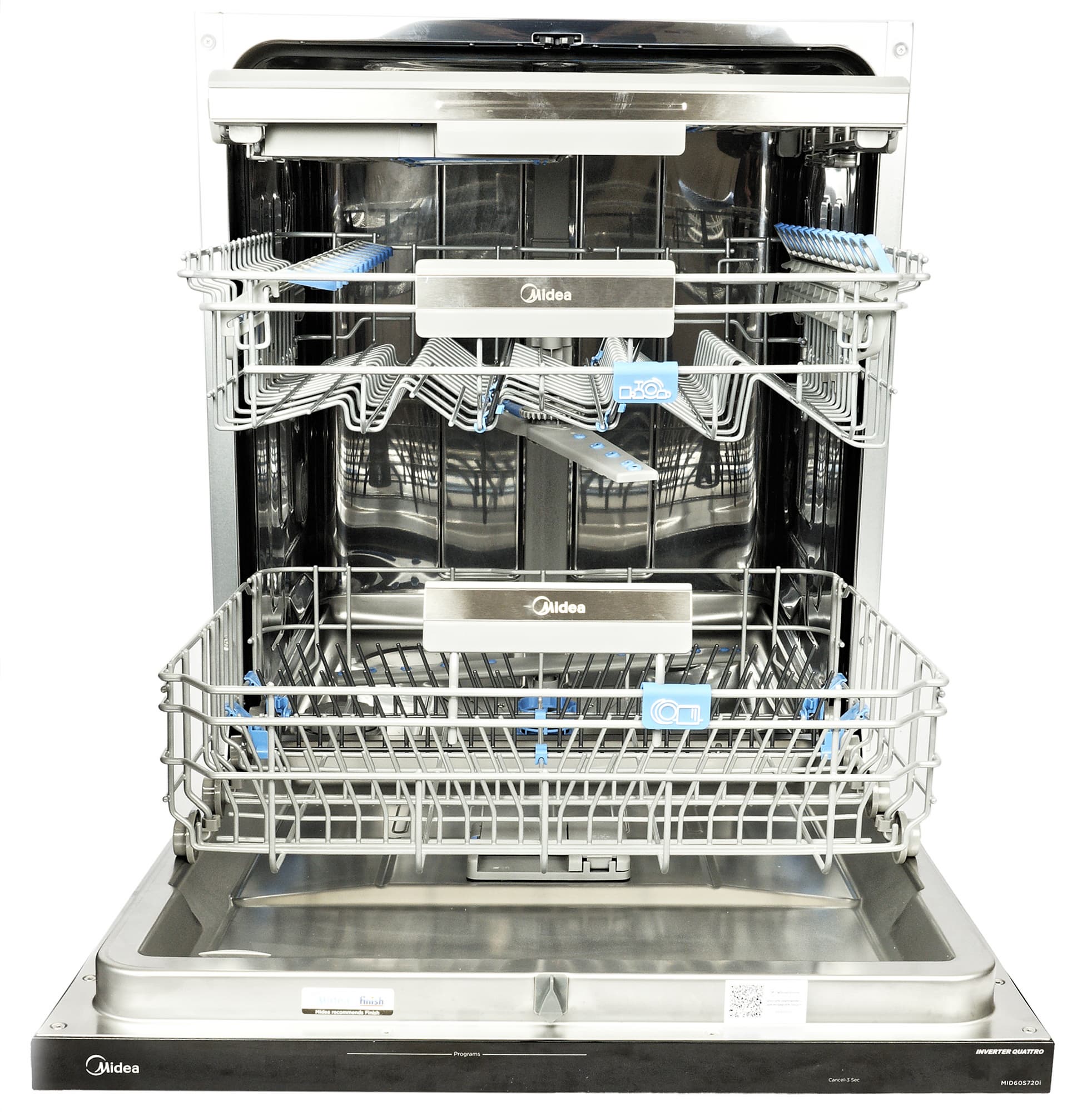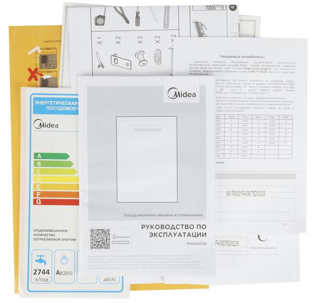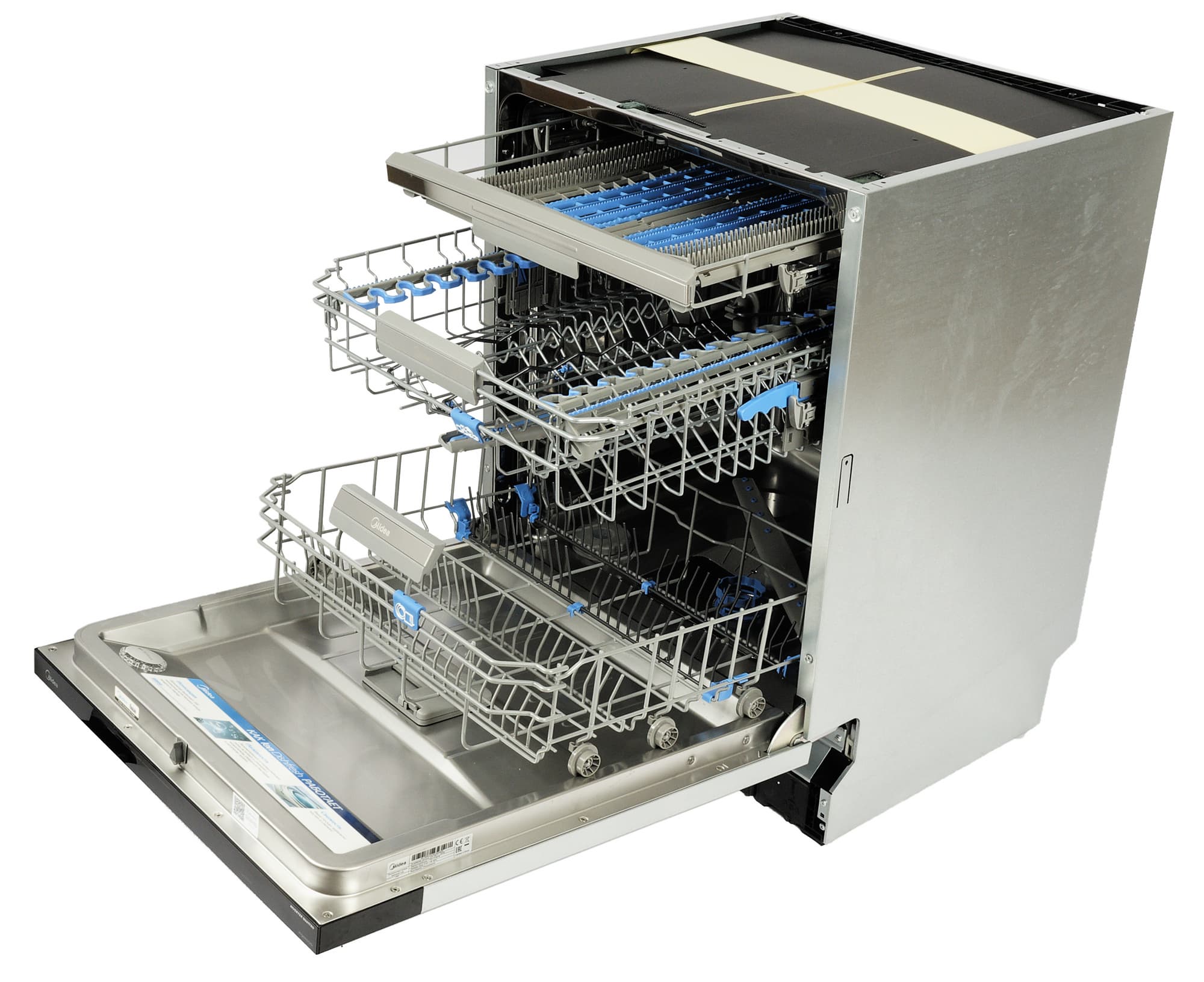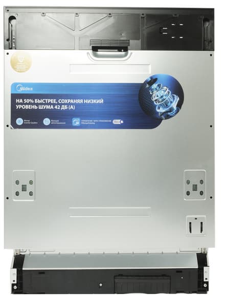 Midea MID60S720i — полновстраиваемая полноразмерная посудомоечная машина. У нее три корзины: нижняя для больших тарелок, кастрюль, сковород и подносов, средняя — для десертных тарелок, чашек, блюдец, мисок и прочей небольшой посуды и верхняя — для столовых приборов.