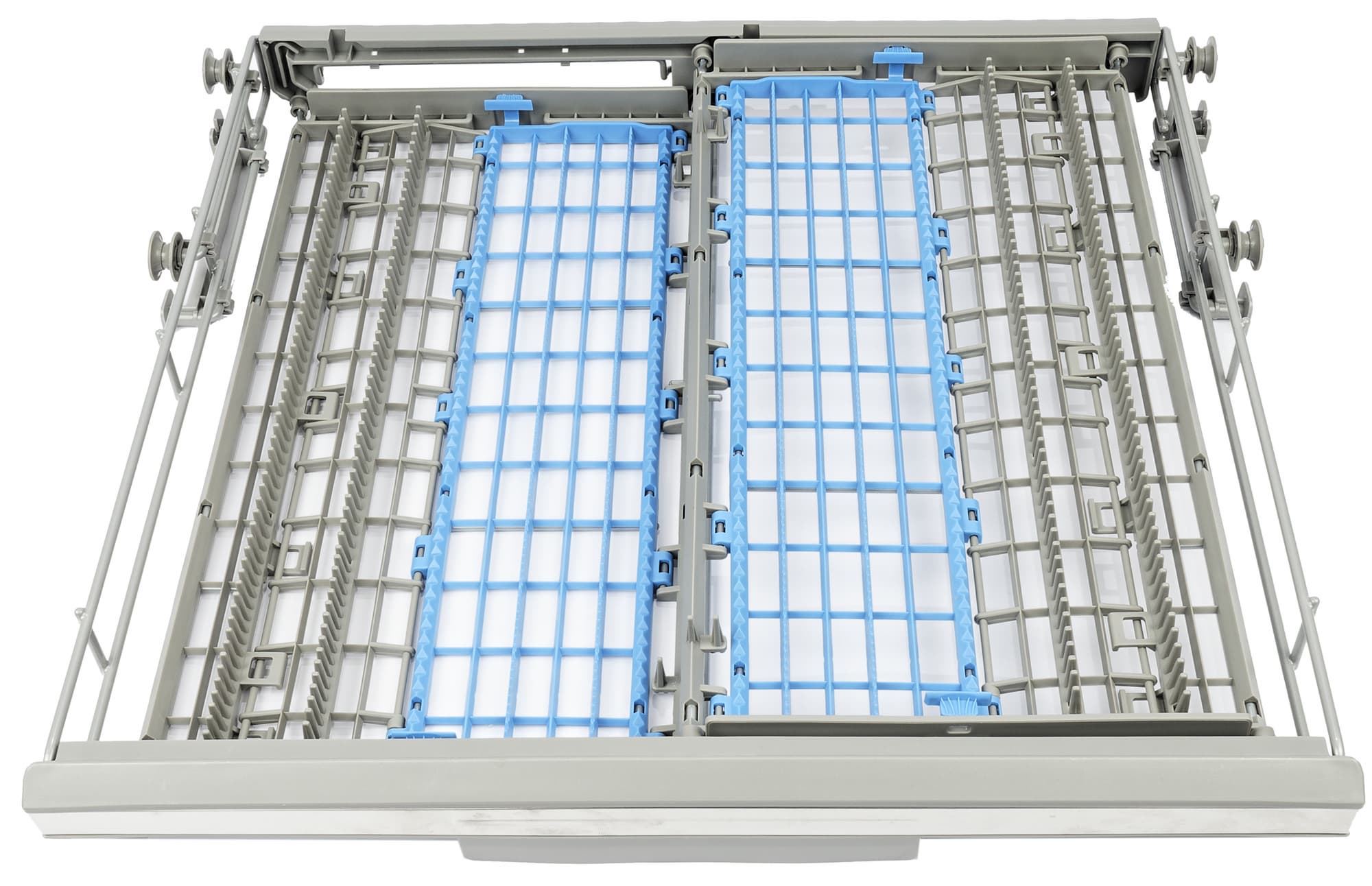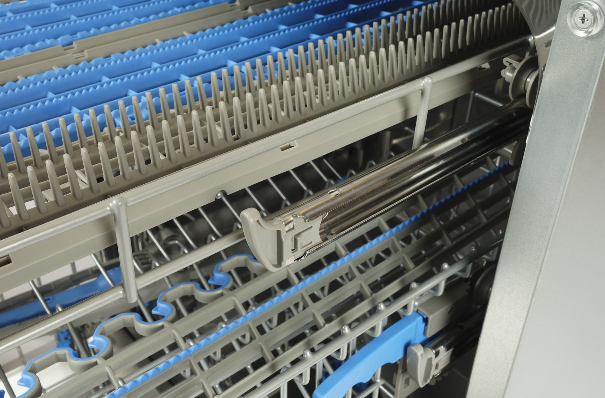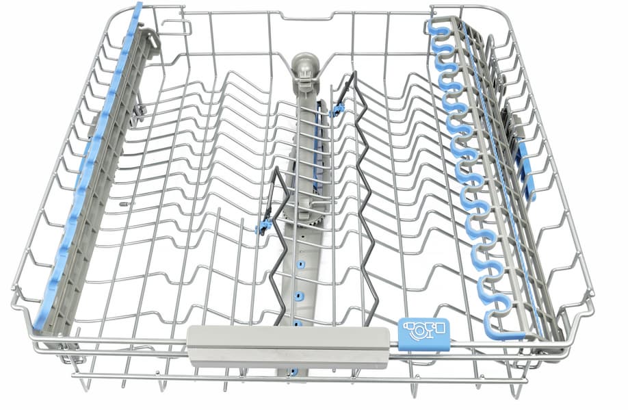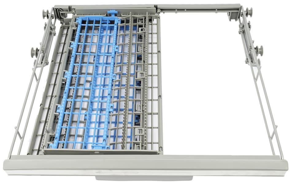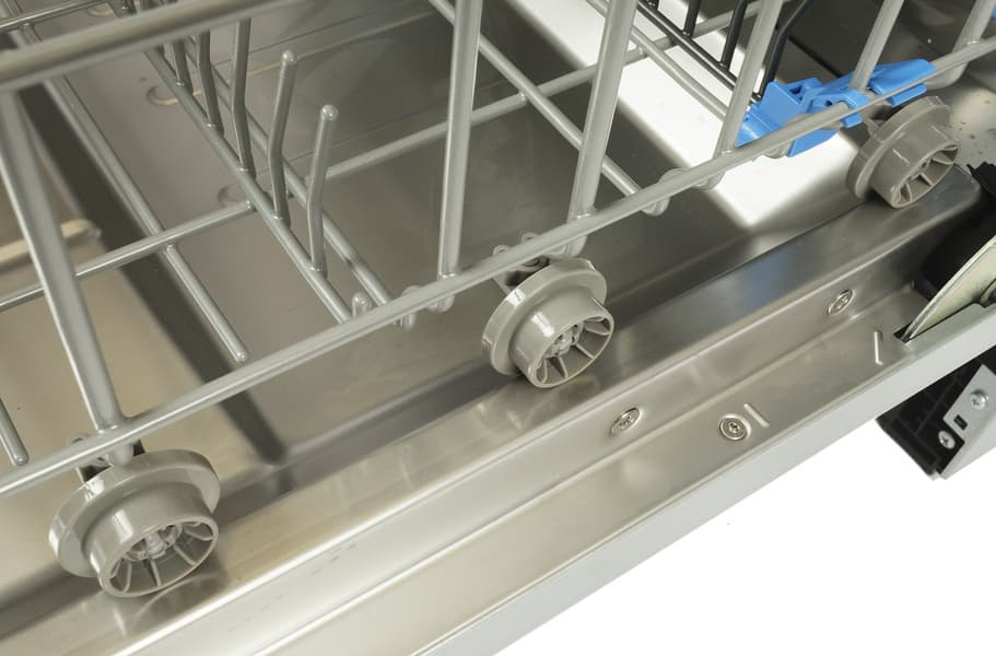 Ролики нижней полки, как и у большинства посудомоечных машин, скользят по выпуклым «рельсам» в корпусе.