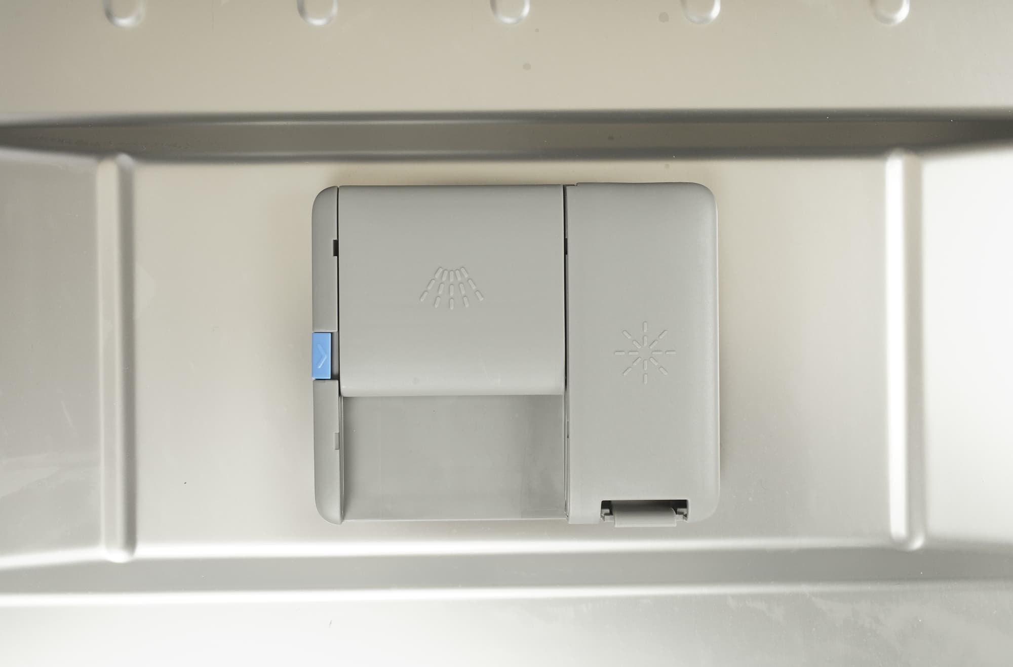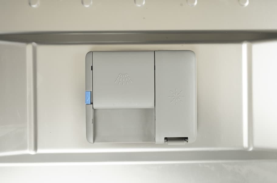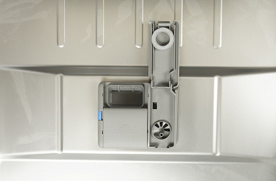 Контейнер для моющих средств разделен на две части: большая, со сдвижной заслонкой, предназначена для порошка и таблеток, а в меньшей за откидывающейся крышкой скрывается резервуар для ополаскивателя.