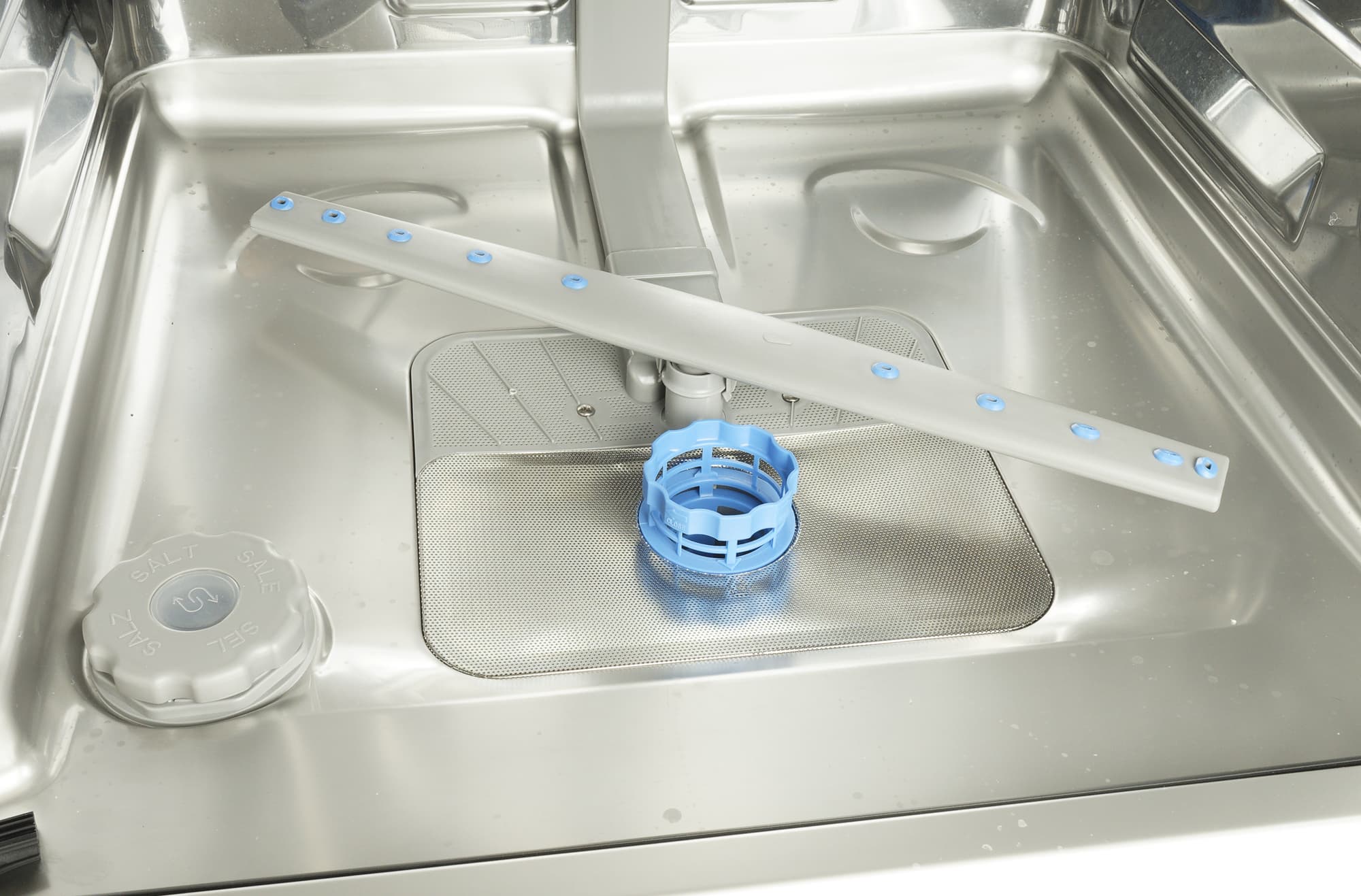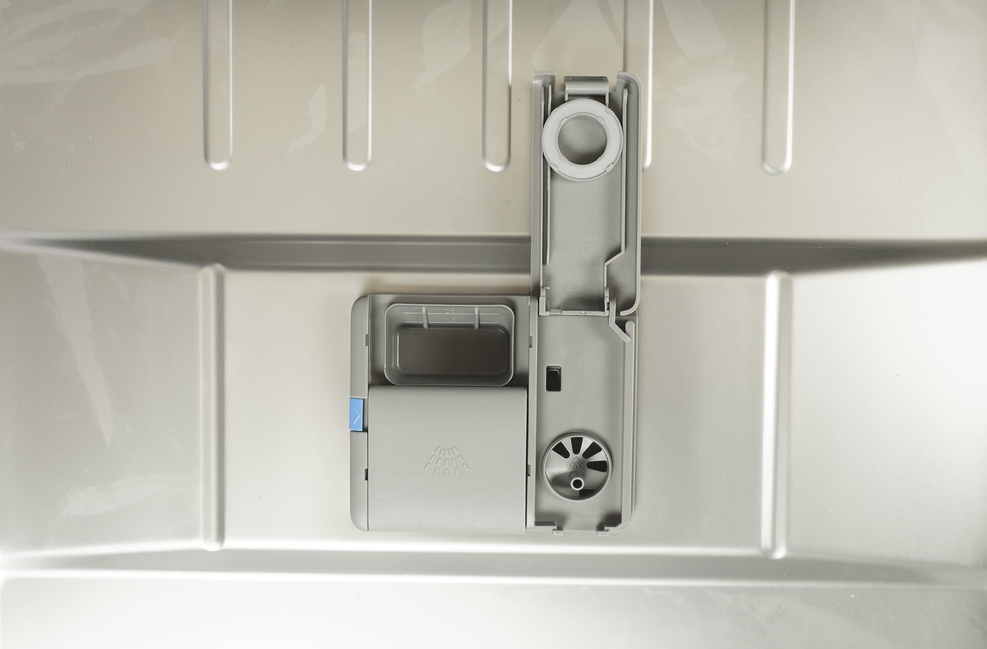 Бак у этой модели сделан из нержавеющей стали. На дне вращается импеллер с десятью отверстиями, разбрызгивающими воду. Под ним — фильтр и крышка смягчителя, через которую засыпается соль.