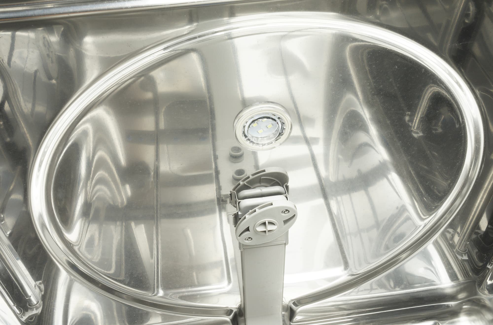 На потолке емкости вращается форсунка, подающая воду на столовые приборы в верхней корзине. Рядом с ней расположен плафон светодиодной подсветки.