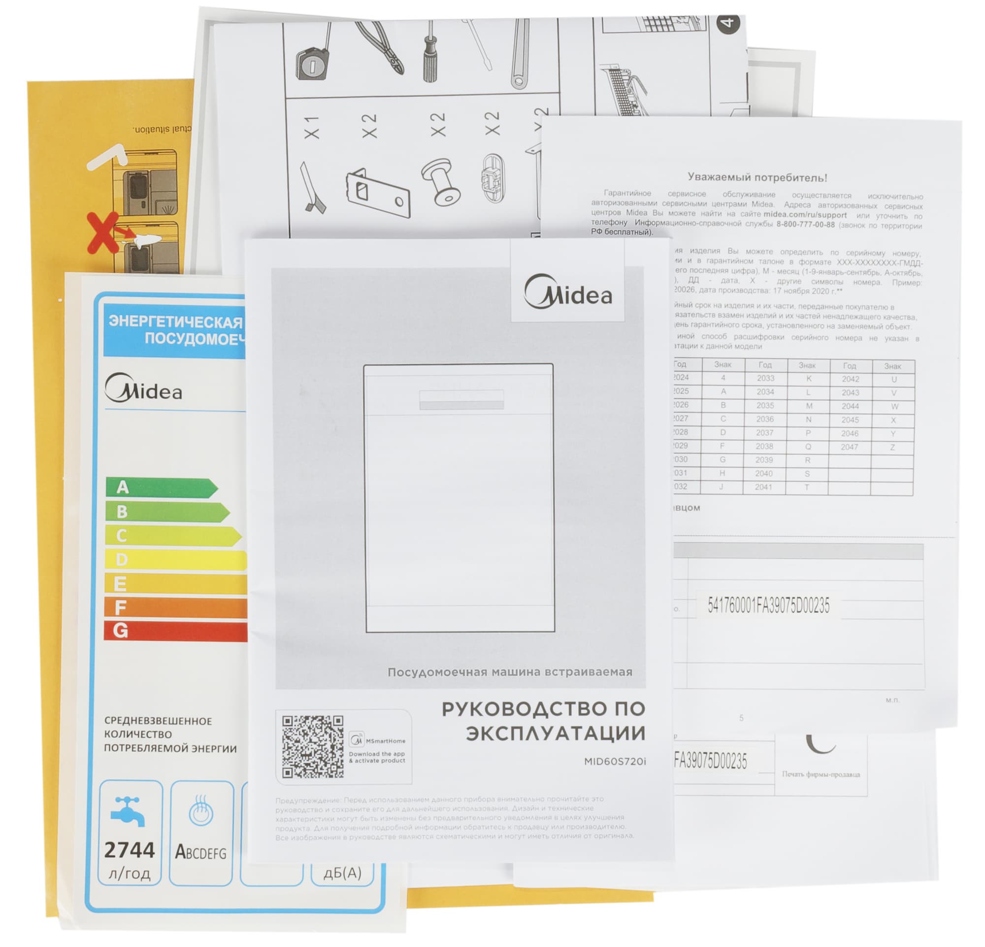 На передней и задней сторонах можно видеть схематическое изображение посудомойки. Всю значимую информацию — индекс модели, серийный номер и заводские отметки — содержат бумажные этикетки на боках коробки. Вскрыв ее, мы обнаружили внутри: