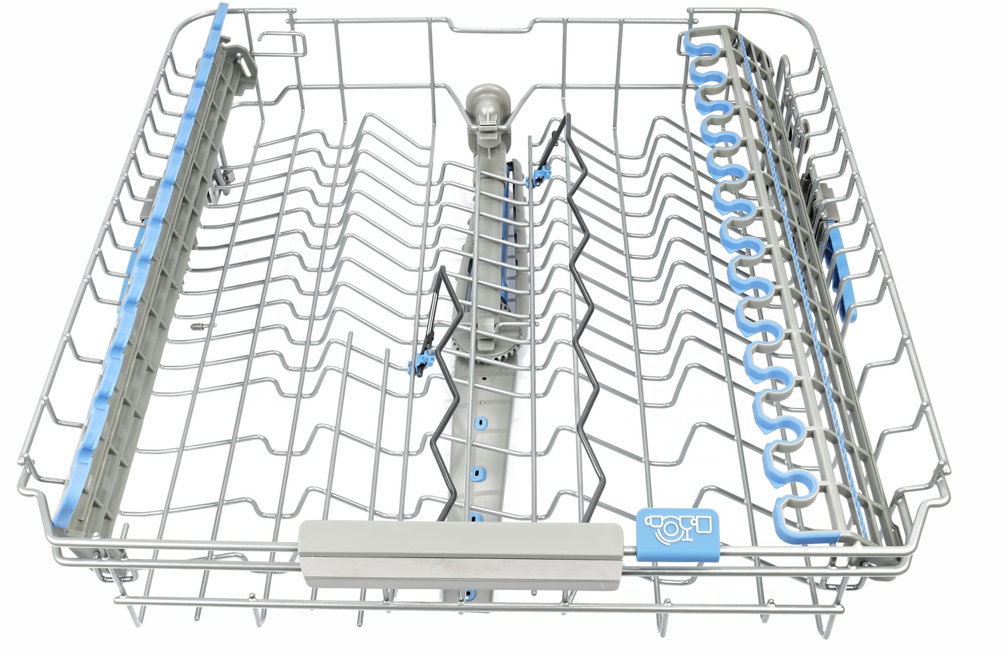 Конструкция средней полки заметно сложнее, чем у нижней. Справа и слева к бокам корзины крепятся откидные подставки для чашек и прочей небольшой посуды — с вырезами для ножек бокалов. В центре размещены два складывающихся держателя: они облегчают размещение стаканов и других высоких емкостей, которые могут перевернуться при мытье.