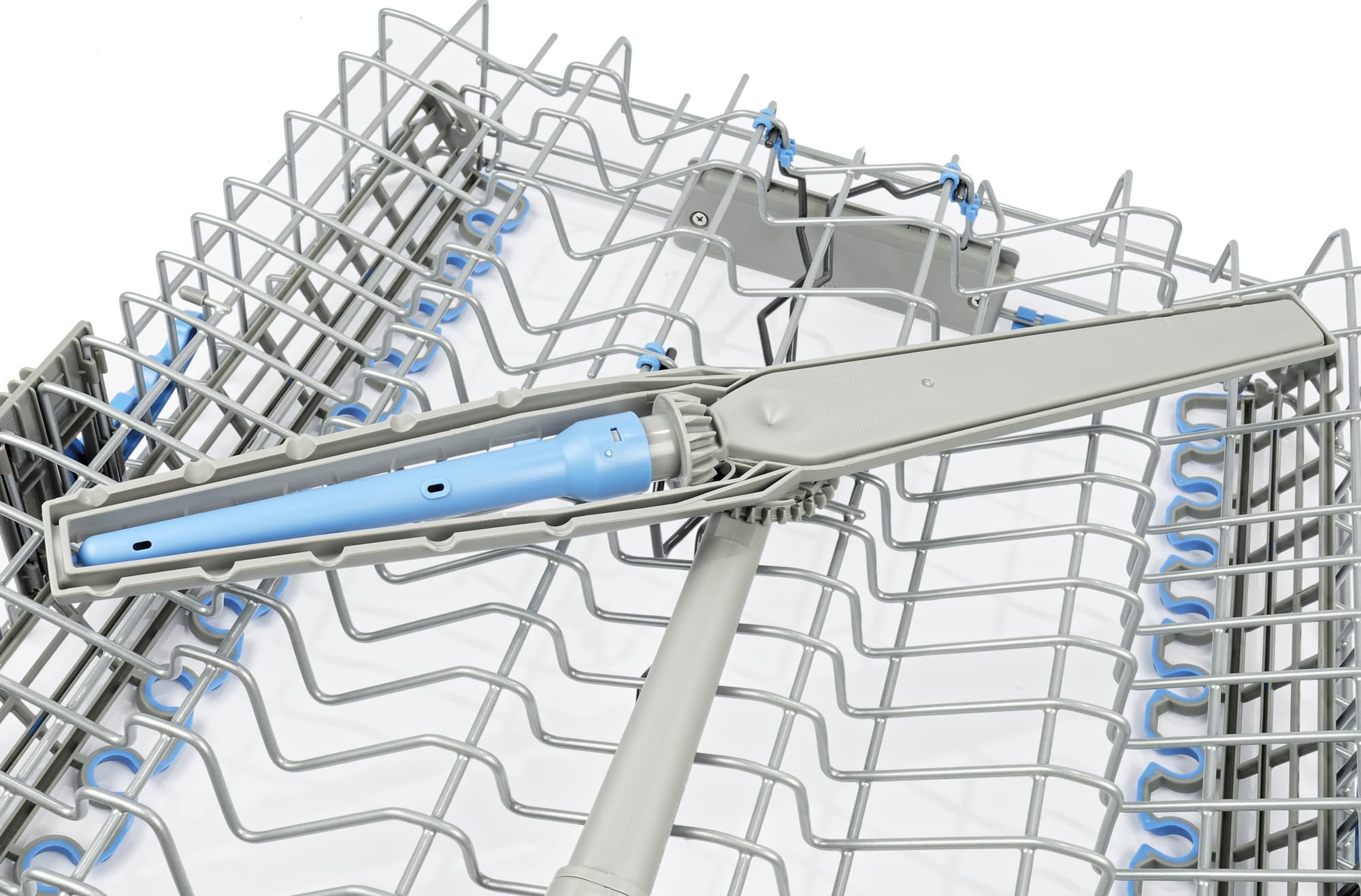 Конструкция среднего разбрызгивателя необычна: одно плечо «коромысла» вращается не только вокруг основной оси, но и в перпендикулярной плоскости при помощи специальной шестеренки. Такая конструкция направляет струи воды на посуду в обеих корзинах под разными углами и способствует лучшему отмыванию при максимальной загрузке.