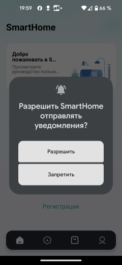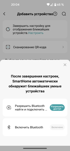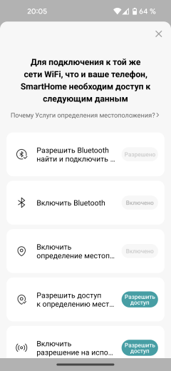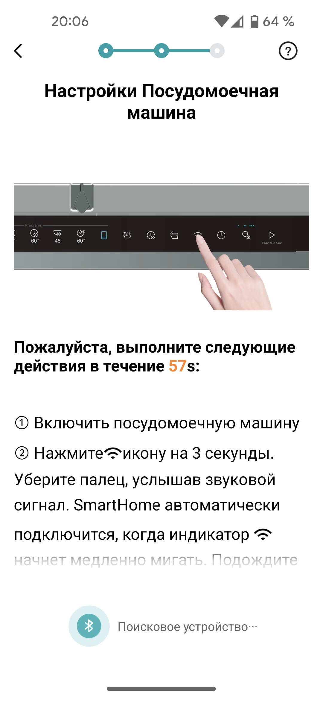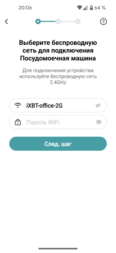 Для сопряжения и работы приложение требует доступа к Bluetooth и данным о местоположении. После выдачи соответствующих разрешений следует ввести пароль к беспроводной сети, включить посудомойку и зажать сенсор с символом Wi-Fi на три секунды, до звукового сигнала.