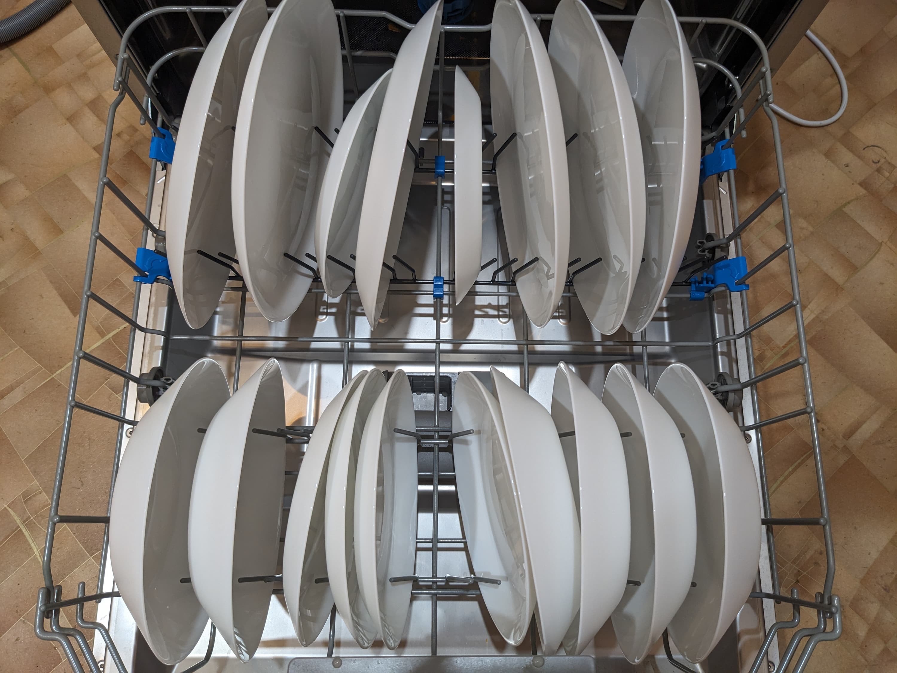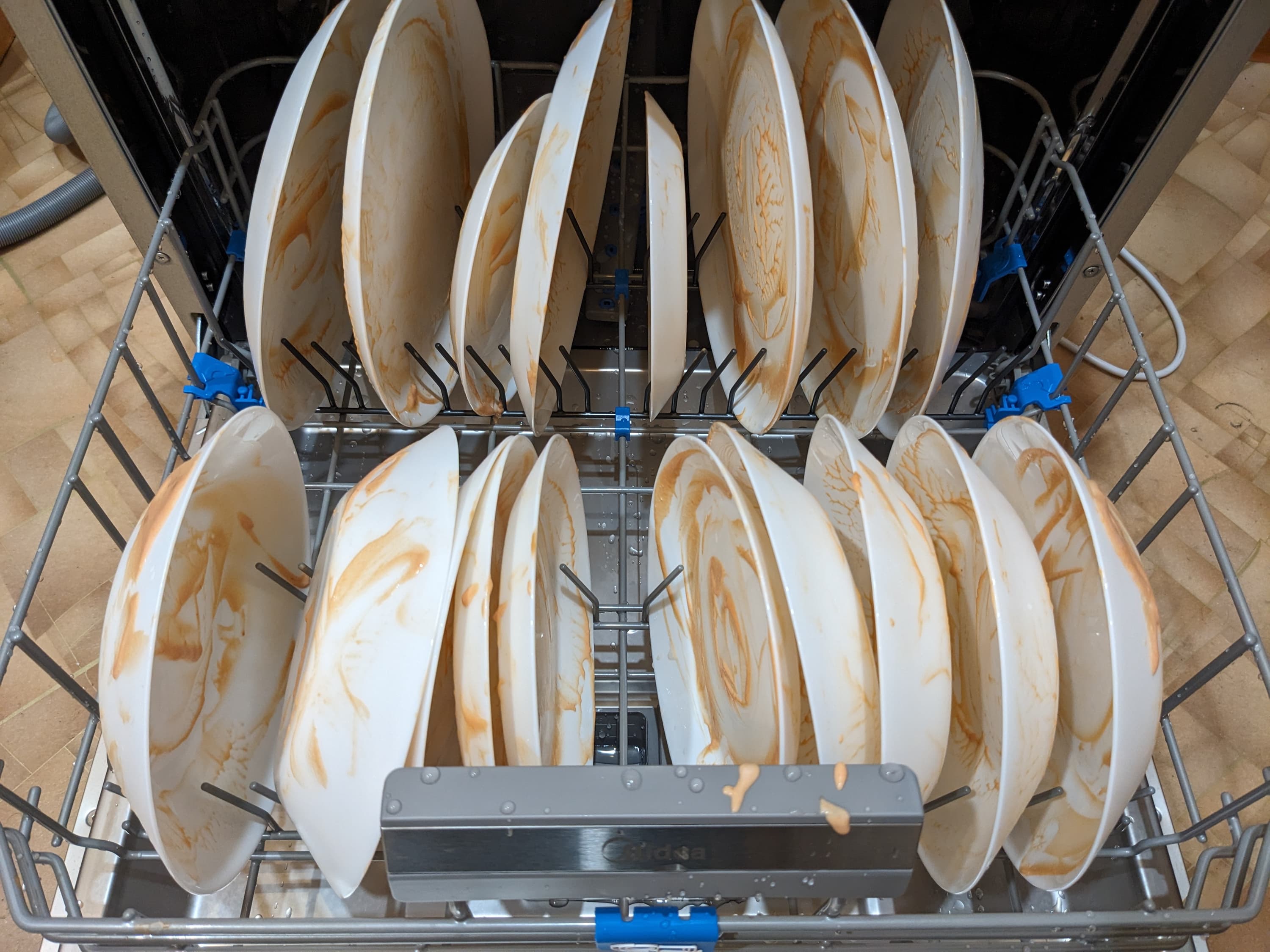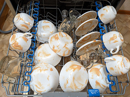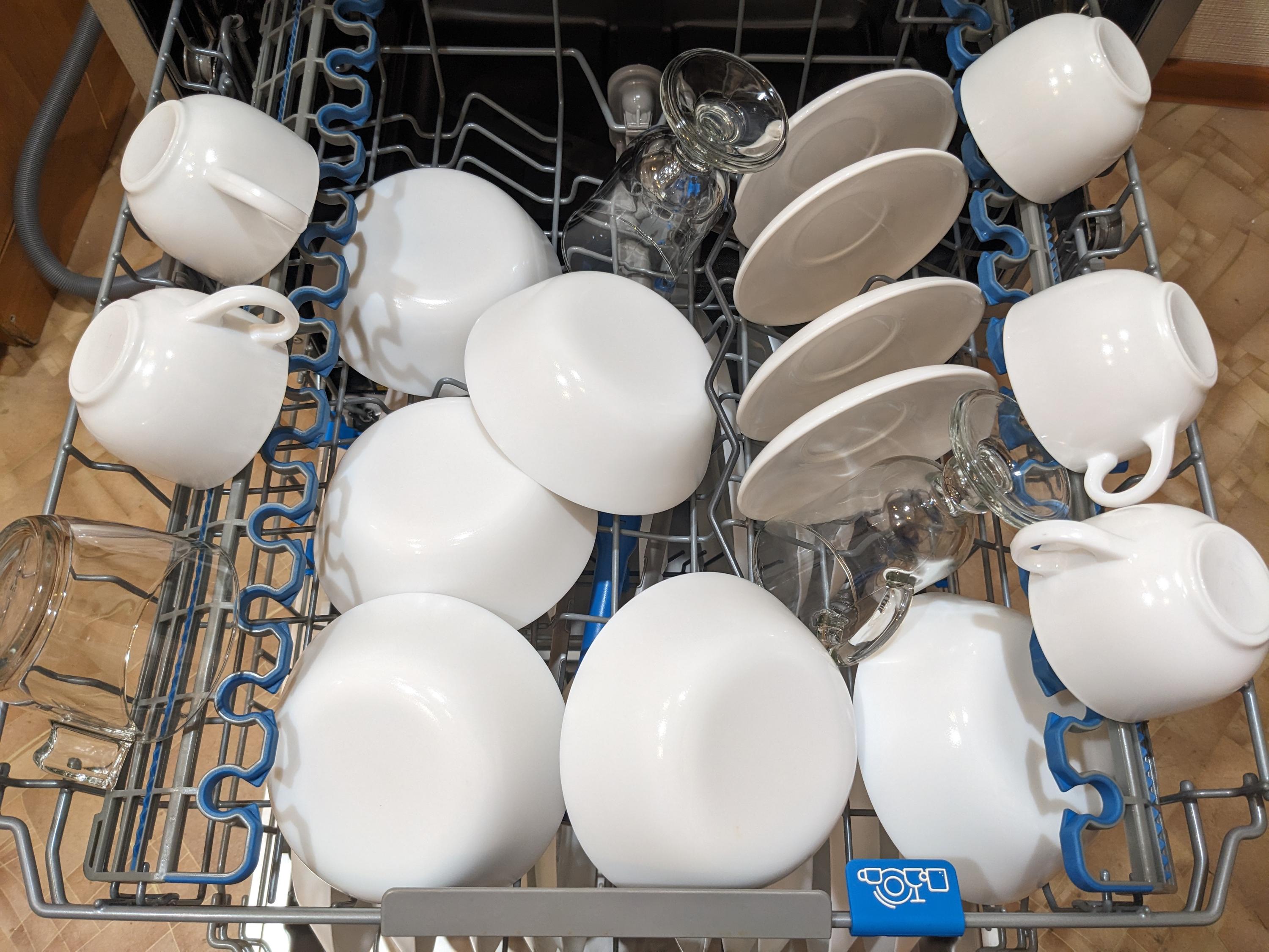 Как обычно, в ход пошла идеальная грязь: простая смесь майонеза и кетчупа — но есть некоторые нюансы. Посуду, которую мы так щедро ею заляпали, сохла в течение суток. А потом мы ее, если называть вещи своими именами, покидали в нижнюю корзину безо всякого порядка. В среднюю распихали фаянсовые миски и блюдца, а чашки поставили на откидную полку. В верхней корзине разложили столовые приборы и кухонные принадлежности, не слишком заботясь об аккуратности.