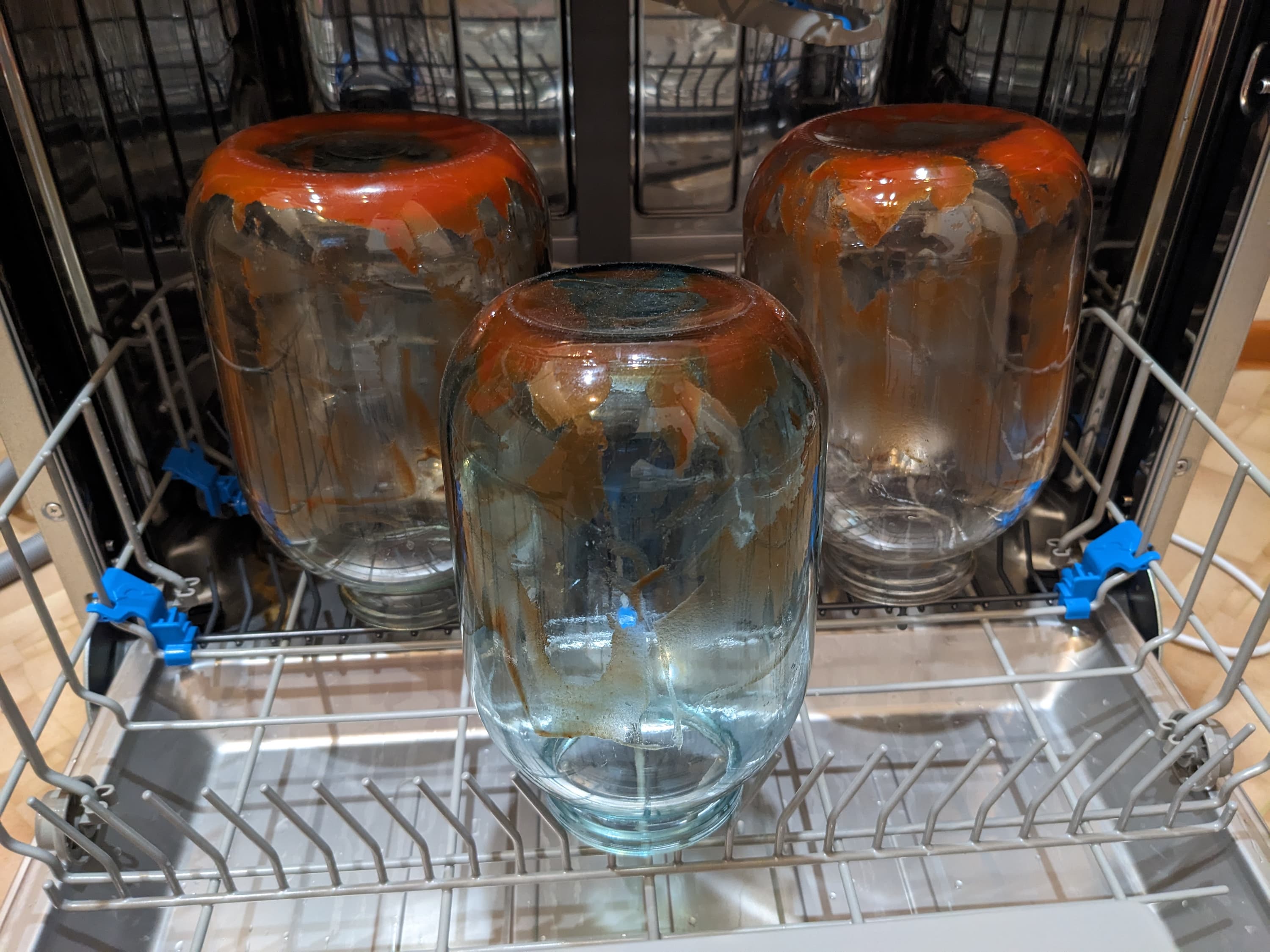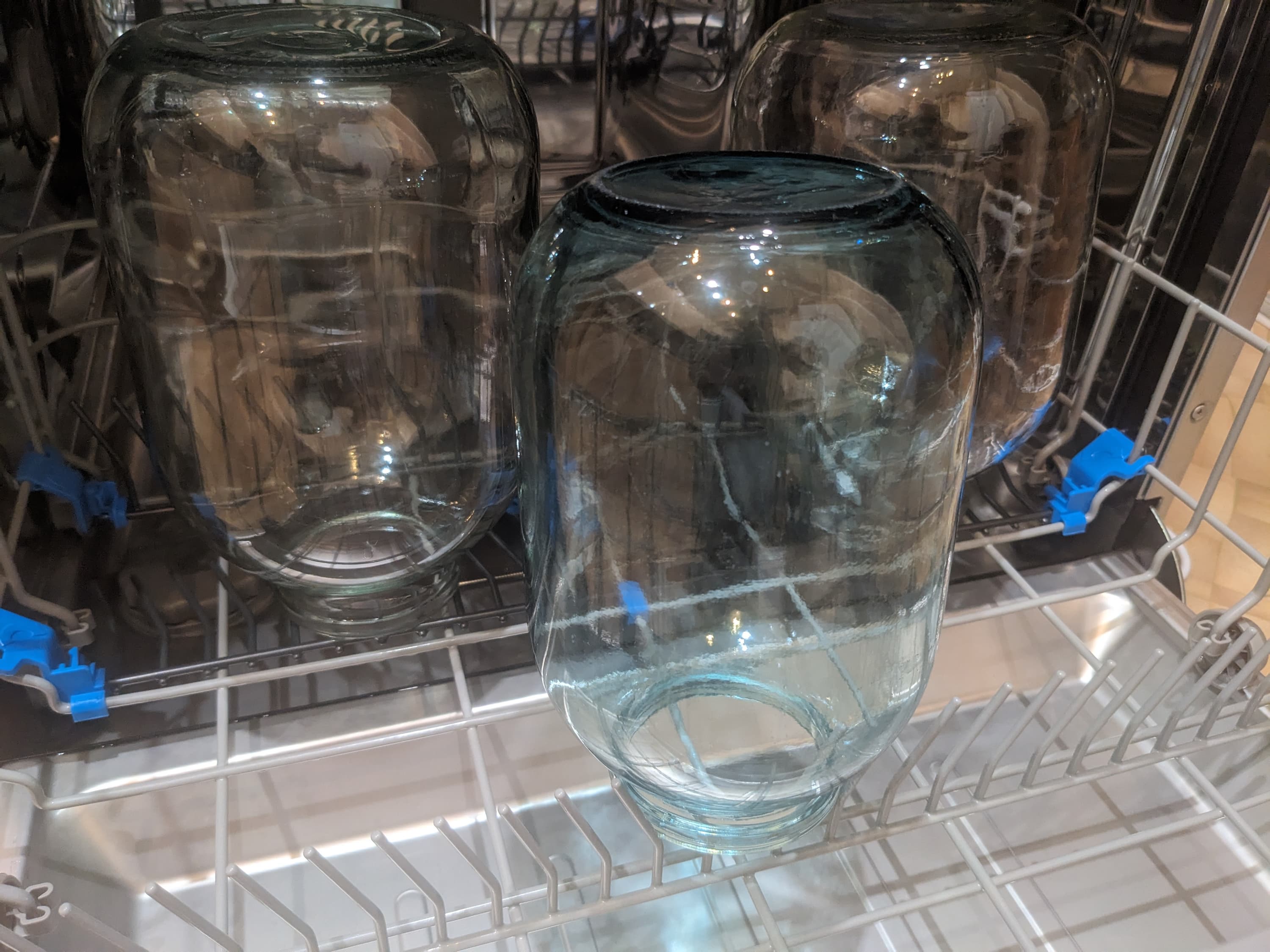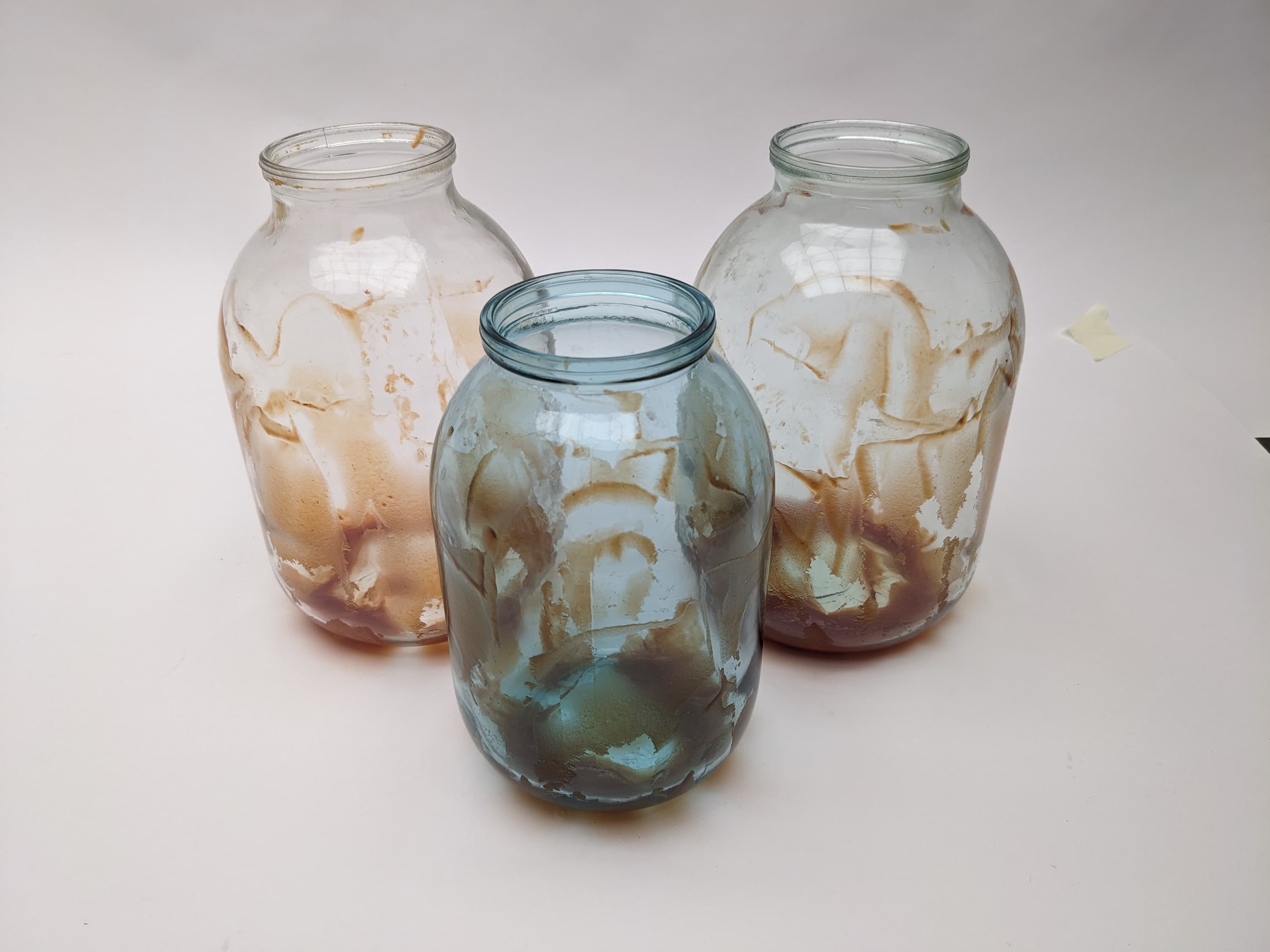Для тестирования автоматической программы мы взяли три банки — двухлитровую и две трехлитровые — и широким жестом оросили их внутренности кетчупом. Как и в предыдущем тесте, запачканная посуда сохла сутки.