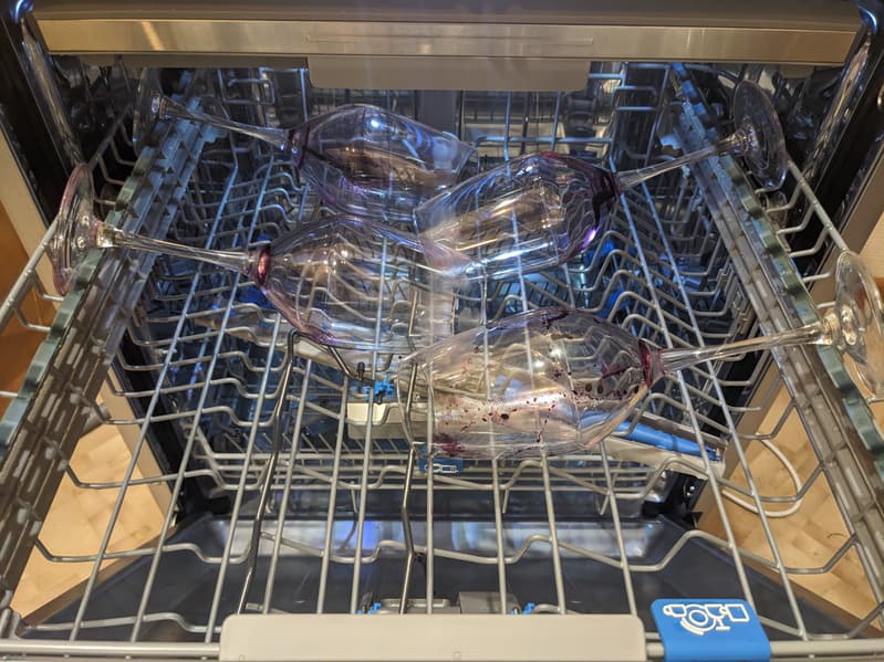 Крупные (600 мл) винные бокалы мы расставили в средней корзине так, чтобы ножки опирались на откидные полки. Ширина вполне достаточна — еще двух-трех гостей можно было бы позвать.