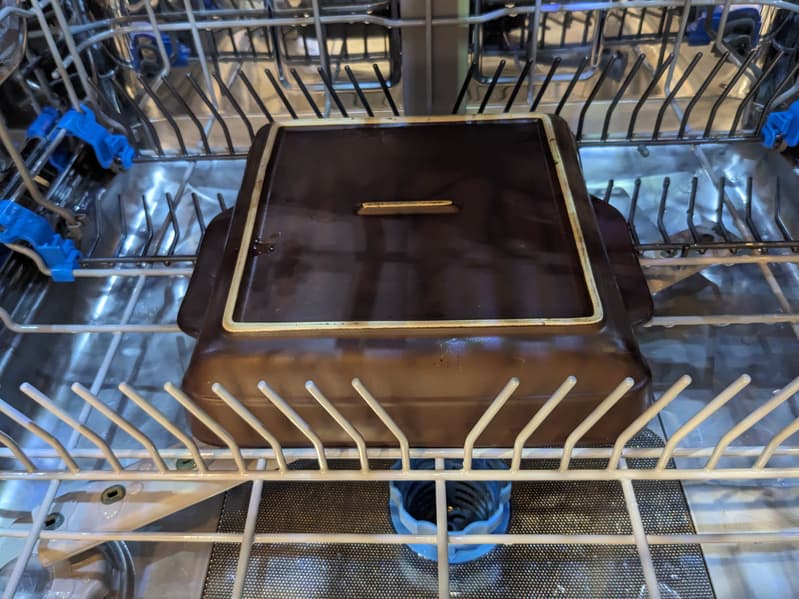 Надо бы еще проверить, как посудомоечная машина справится со сложными случаями. Ну и, как обычно, нам на помощь пришла керамическая форма, в которой мы запекли мясо под сметанным соусом.