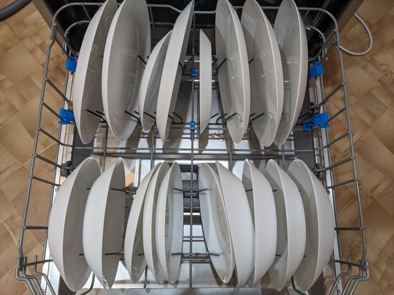 Для этого теста мы использовали стандартную программу «Эко», оптимизированную с точки зрения расхода электроэнергии и воды. Результат оказался просто прекрасным: посуда в нижней и средней корзинах отмылась до скрипа, следов загрязнений мы не обнаружили ни визуально, ни на ощупь. Идеальной чистоты достигли и столовые приборы на верхней полке.