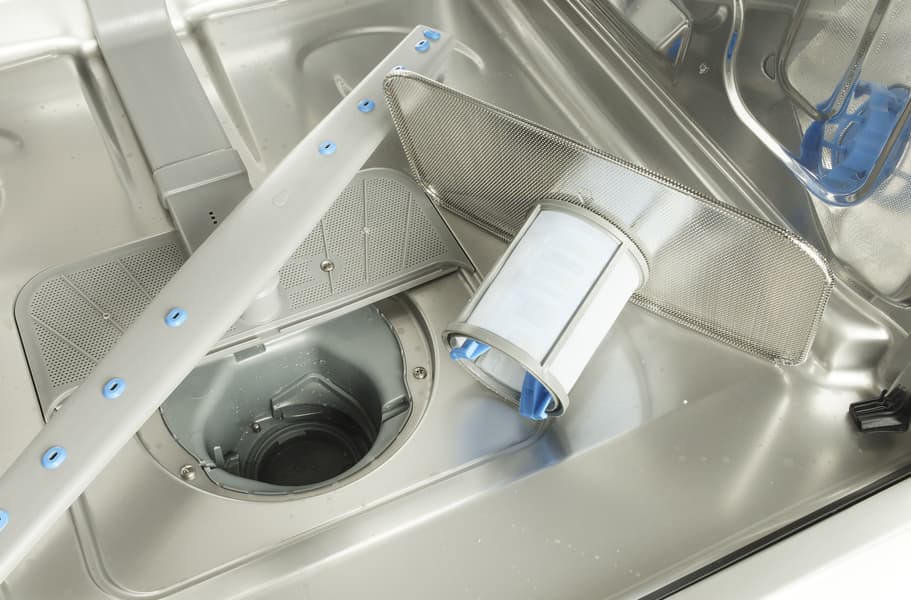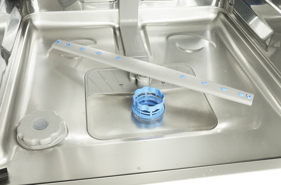 Фильтр посудомоечной машины следует время от времени извлекать, удалять из него посторонние предметы и загрязнения и промывать водой. О необходимости очередного обслуживания системы фильтрации своевременно напомнит приложение для смартфона — нужно только не забывать сбросить межсервисный интервал после установки фильтра на место.