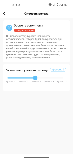 В зависимости от параметров используемой воды расход соли и ополаскивателя можно (и нужно) настраивать. В Петербурге, с его мягкой водой, мы обычно выставляем минимальное потребление того и другого. При таких настройках наша посудомойка полностью отключает подачу соли в смягчитель. А вот использование хотя бы минимального количества ополаскивателя все равно требуется: установка его расхода на минимум не отключает предупреждений об отсутствии жидкости в приложении и на панели управления.