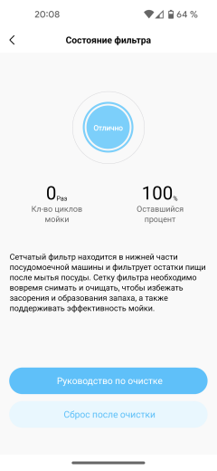Здесь же можно видеть информацию о состоянии фильтра. Посудомойка ведет учет межсервисного пробега и, когда он приблизится к критическому значению, предложит его промыть и сбросить интервал обслуживания.