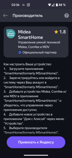 Для подключения посудомойки к «Алисе» следует воспользоваться кнопкой «добавить устройство умного дома», выбрать в списке «навыков» «Midea SmartHome», прочитать инструкцию и нажать на ссылку «Привязать к Яндексу». Приложение потребует аутентифицироваться с данными, которые мы ввели при регистрации в SmartHome, и успешно завершит сопряжение.