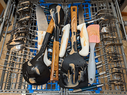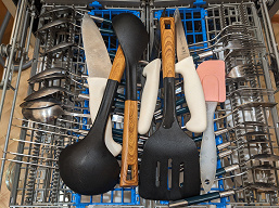 Качество сушки тоже нам понравилось: ни капли на посуде не осталось, чуть влажными оказались только пластиковые детали кухонных принадлежностей на верхней полке: конденсационная сушка не всегда хорошо срабатывает на пластмассе.