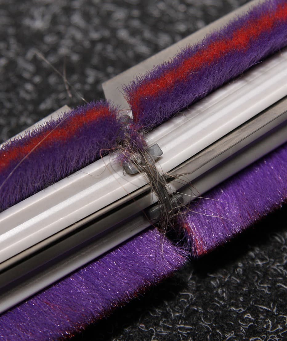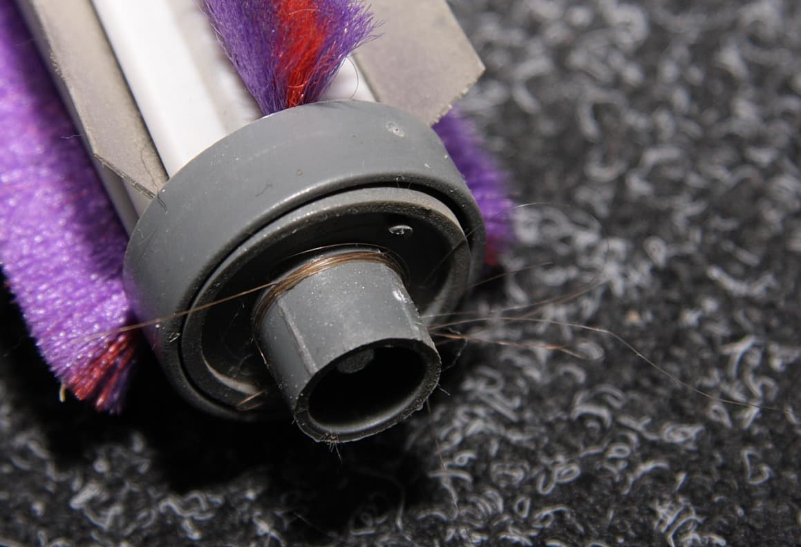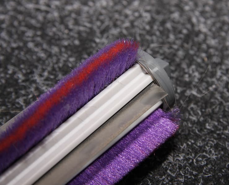 Вал основной щетки гладкий, относительно большого диаметра и с продольными канавками — это облегчает освобождение вала просто пальцами без помощи инструментов от ниток, волос и прочего намотавшегося. Щетина на этой щетке густая и мягкая. В помощь щетине работают лопасти из тонкого упругого пластика.