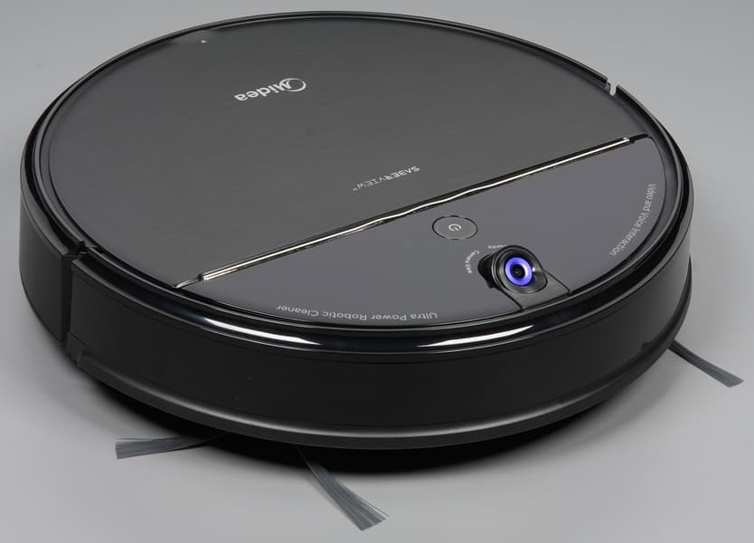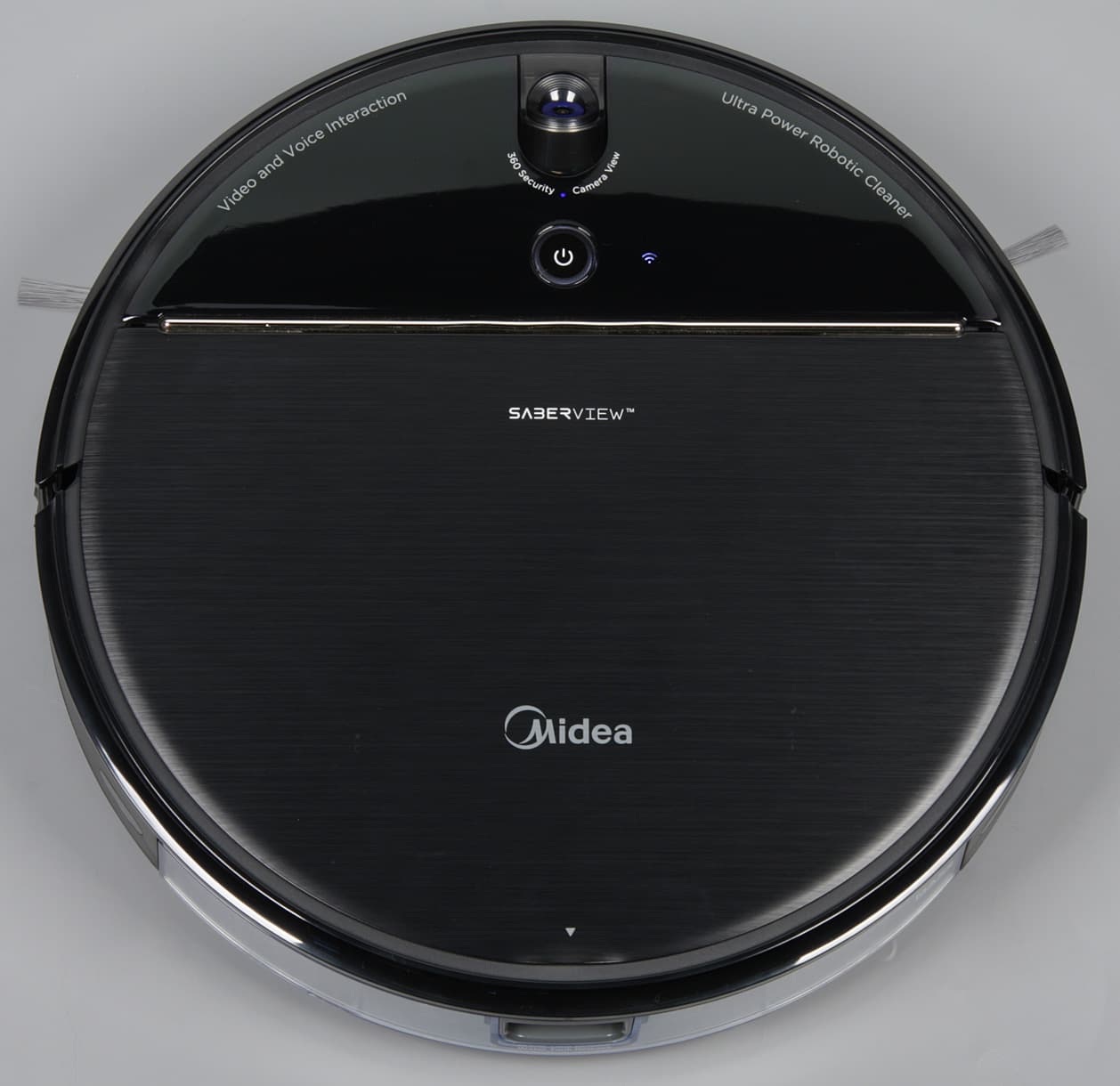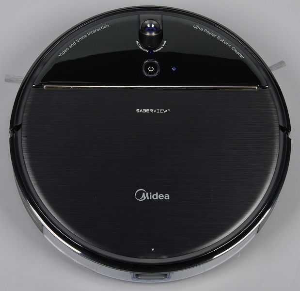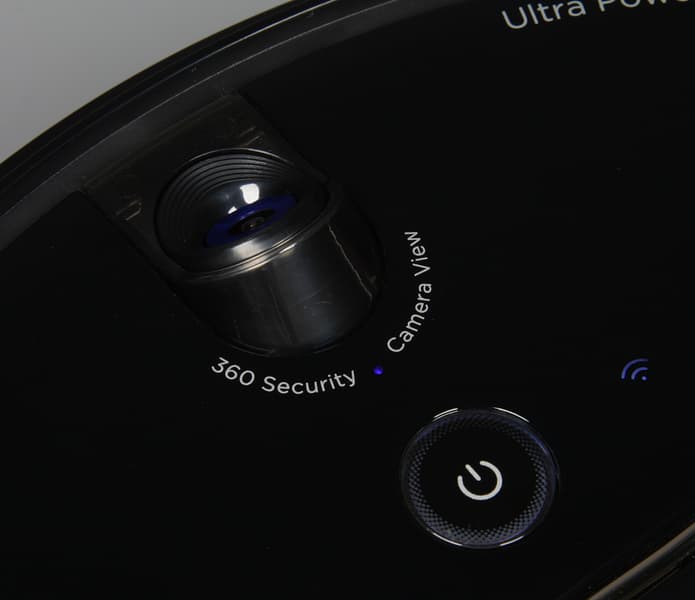 Передний сегмент верхней панели изготовлен из прозрачного пластика с черным покрытием и прозрачным защитным слоем. Участки, где отсутствует черное покрытие формируют обозначения индикаторов. Как минимум есть индикатор камеры (синее свечение), Wi-Fi (белое) и режима возврата на базу (красное). Единственная кнопка на верхней панели изготовлена из прозрачного пластика. Черный кружок в центре кнопки выделяет белый значок питания, а снизу кнопка подсвечивается белым светодиодом. Камера смотрит вперед и вверх. Ее защищает прочный козырек. При нажатии на камеру она уходит внутрь на пару миллиметров, при этом, судя по звуку, срабатывает микропереключатель, помогающий роботу определить, что камера столкнулась с каким-то препятствием, и вовремя сдать назад. Впрочем, козырек все равно чуть выше камеры, из-за чего робот все же может застрять под невысокими предметами обстановки.