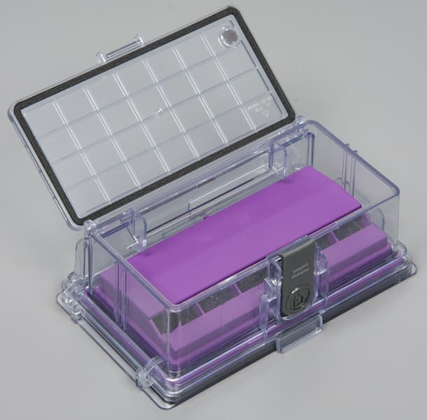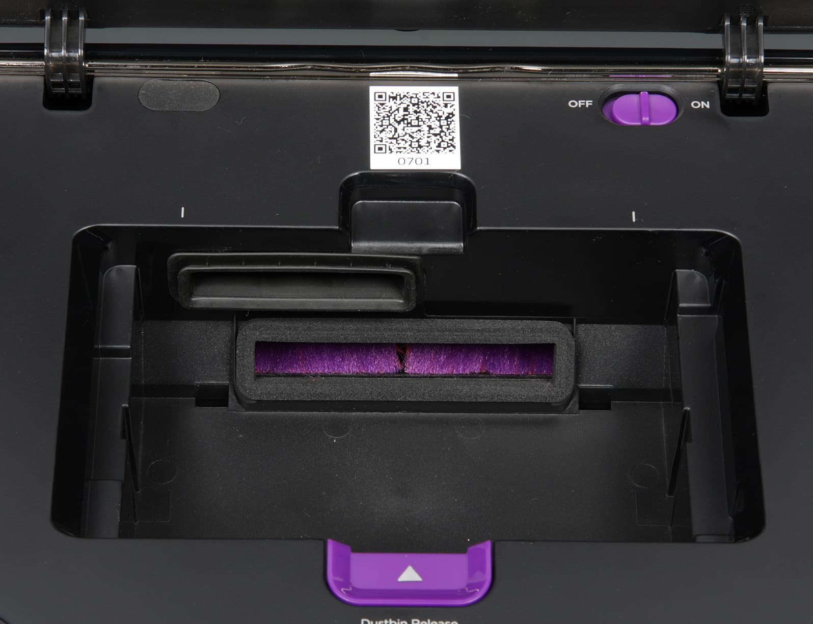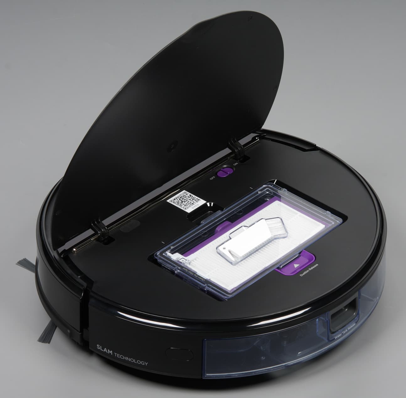 Крышка фиксируется в открытом состоянии, но не в закрытом, поэтому при перевороте робота вверх колесами она открывается. Пылесборник, впрочем, не выпадает, так как надежно зафиксировал. Что вынуть его, нужно нажать на сиреневую кнопку, ухватить его двумя пальцами и потянуть вверх. Корпус пылесборника выполнен из слегка тонированного полупрозрачного пластика — можно рассмотреть степень его заполнения. Входное отверстие расположено на достаточной высоте, чтобы при аккуратных манипуляциях с закрытым пылесборником мусор не выпадал. Дополнительно отверстие изнутри прикрывает шторка из прозрачного пластика. При нажатии на фиксатор дно пылесборника откидывается на большой угол, что позволяет без труда вытряхнуть скопившийся мусор.