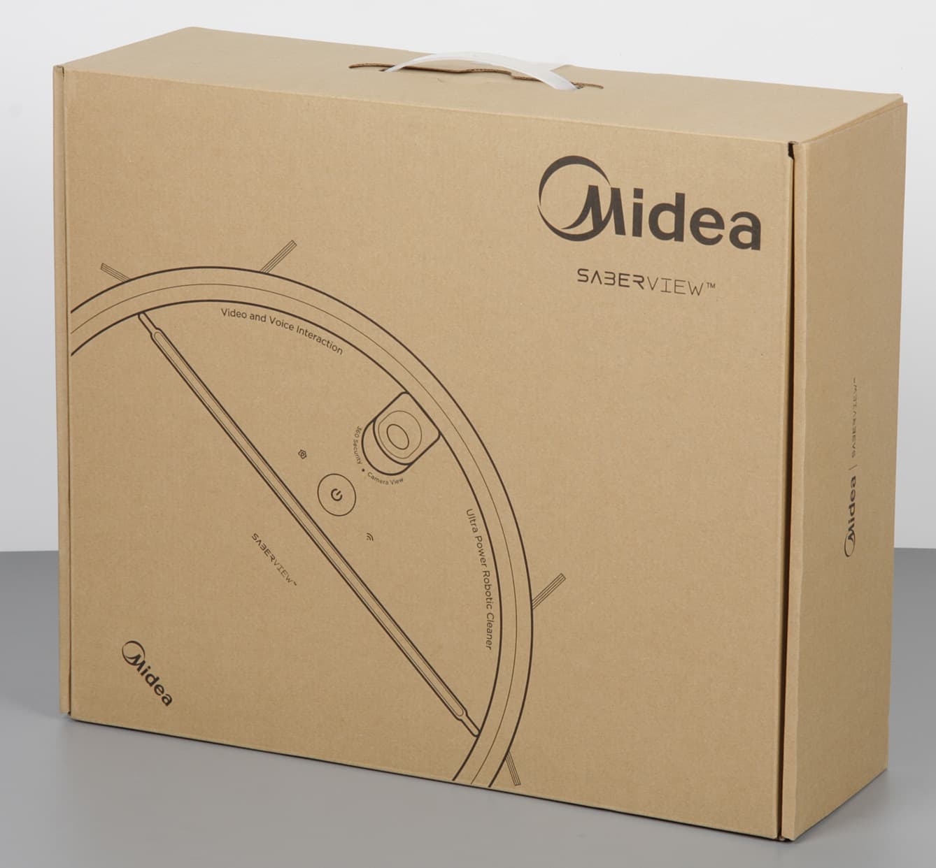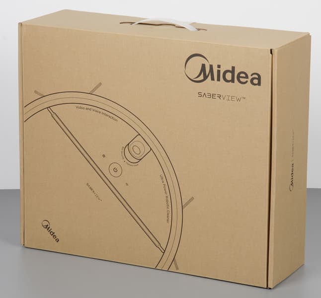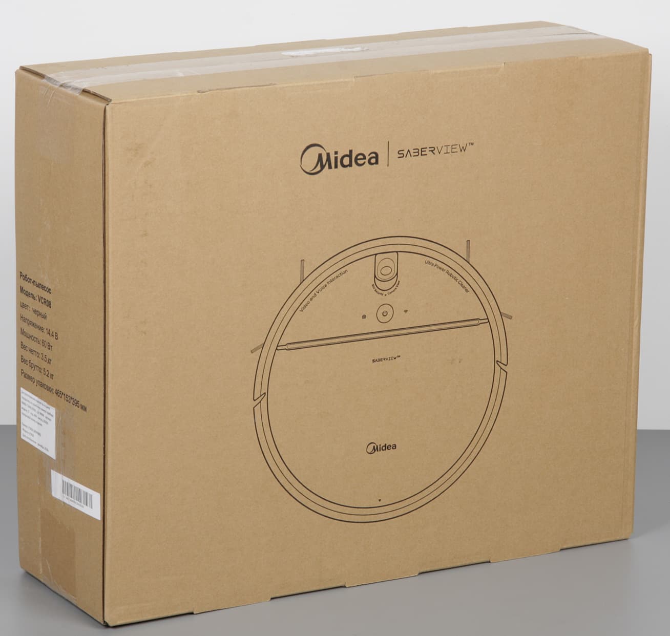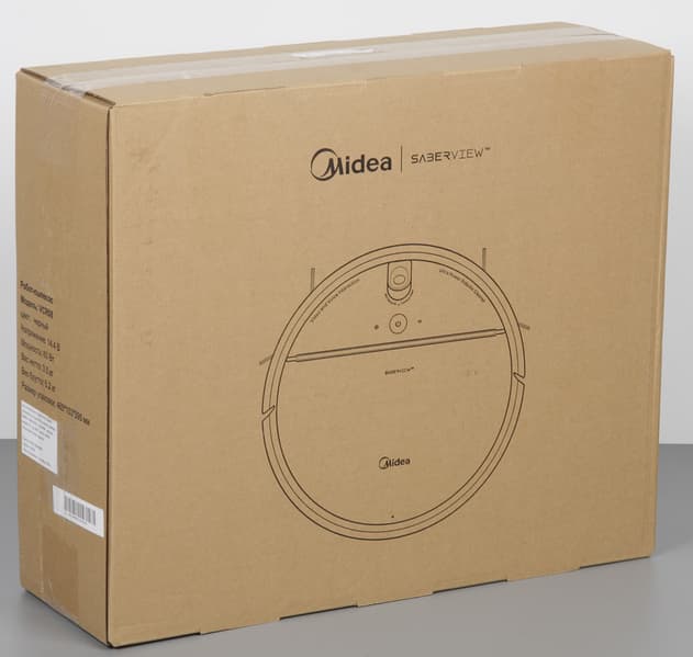 Робот-пылесос Midea VCR08 упакован в две скромно оформленные коробки из гофрокартона — внешнюю защитную, и внутреннюю уже с ручкой.