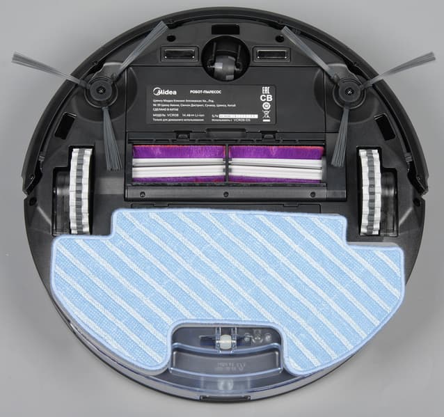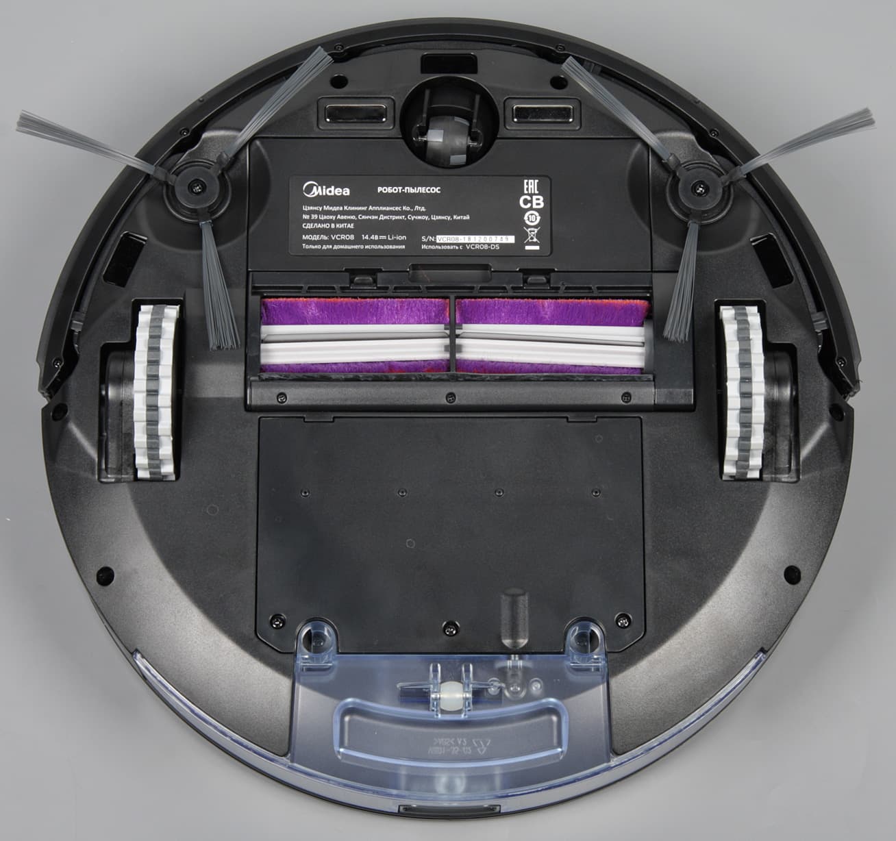 На днище расположены две контактные площадки, передний опорный поворотный ролик, боковые щеточки, крышка батарейного отсека, отсек основной щетки, два ведущих колеса, панель с четырьмя отверстиями подачи воды. Ближе к краю сразу за бампером расположены три ИК-датчика перепада высоты, благодаря которым робот-пылесос может избежать падения со ступенек.