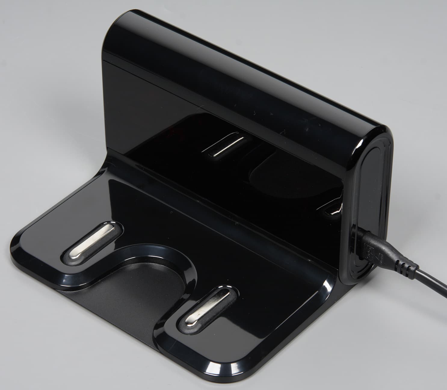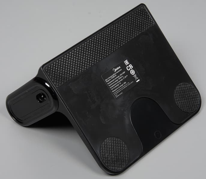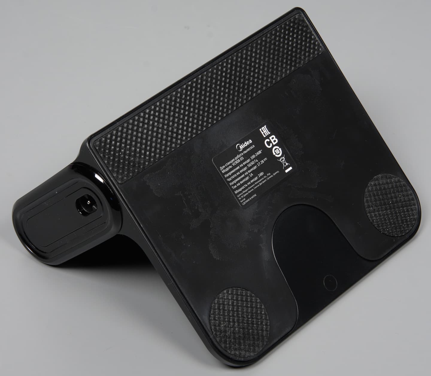 База, на которой пылесос заряжается, имеет большое основание, на которое снизу наклеены три противоскользящие резиновые накладки.