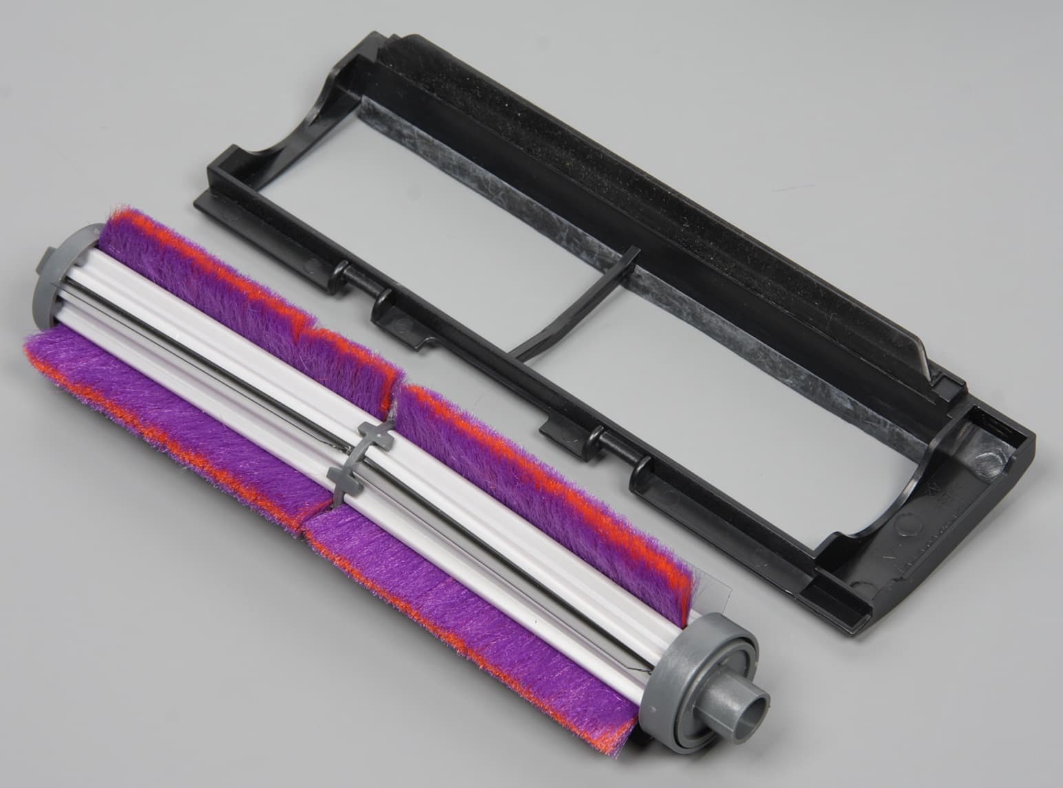 На оба торца щеток плотно насажены заглушки из серого пластика. На одной — выступ привода, на второй — подшипник скольжения, закрытый кожухом, который просто так не снимается. Щетка в отсеке удерживается специальным фиксатором. На рамке отсека щетки есть резиновый скребок, который помогает щетке подхватывать мусор с пола и забрасывать его в пылесборник. Край рамки может с ходом порядка 4 мм перемещаться вверх-вниз, следуя рельефу пола. Все это, по идее, должно способствовать повышению качества уборки.