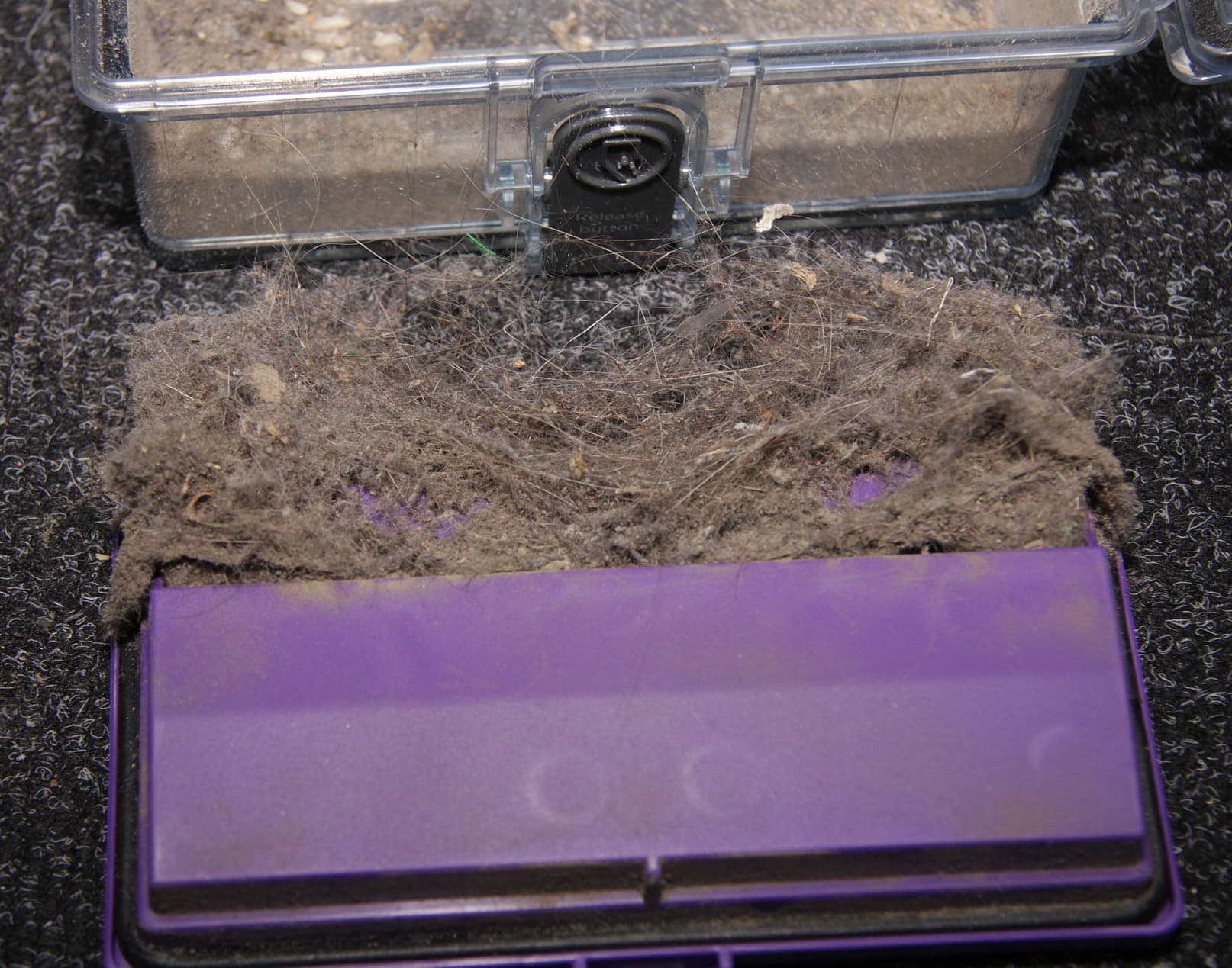Все намотавшееся легко снялось просто пальцами. В пылесборнике легкий мусор собрался вверху у фильтров, тяжелый — лежал на дне.