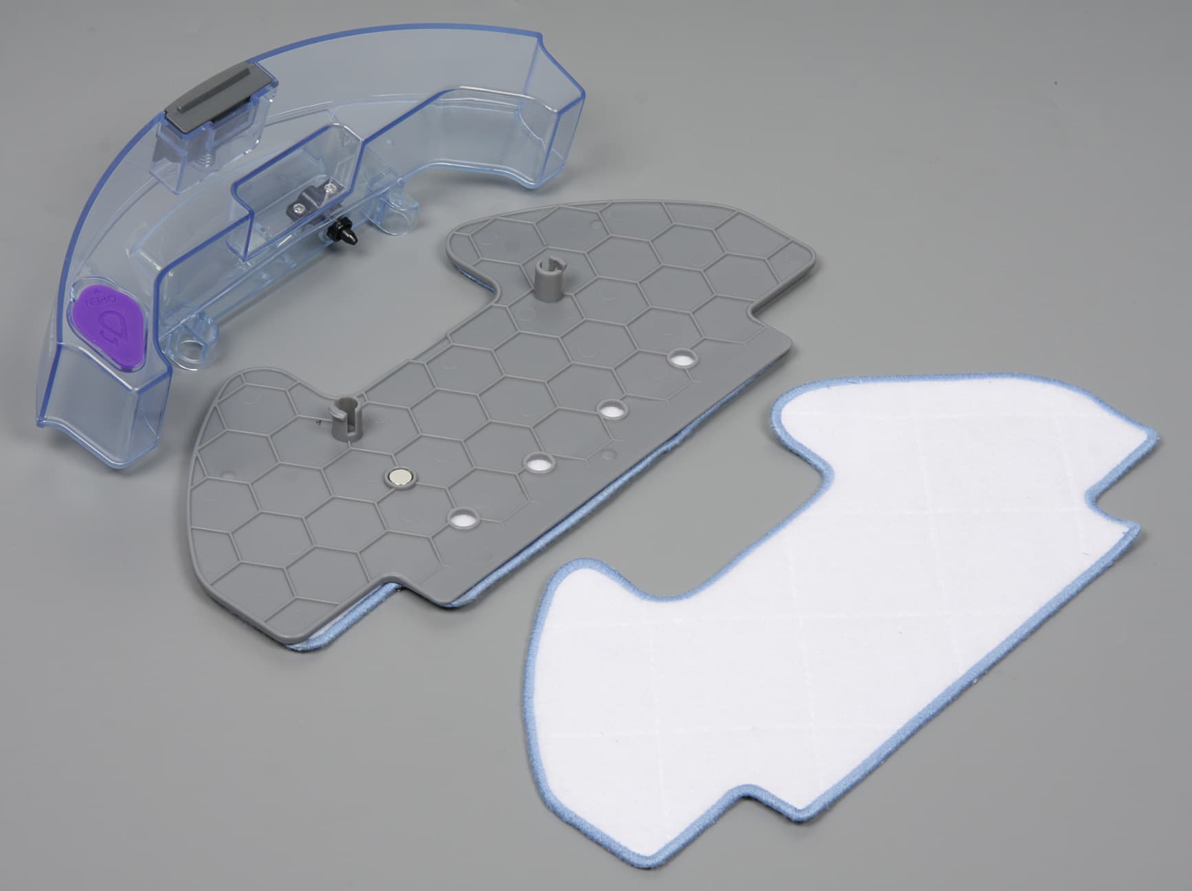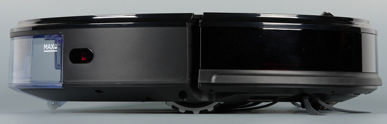 Отметим, что в отличие от большинства роботов с функцией влажной очистки в этом резервуар выполнен в виде отдельной детали, а не устанавливается вместо пылесборника, поэтом робот может одновременно выполнять полноценную сухую чистку пола и протирать его салфеткой.
