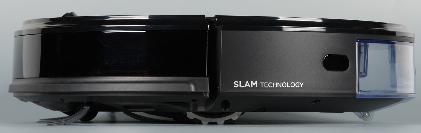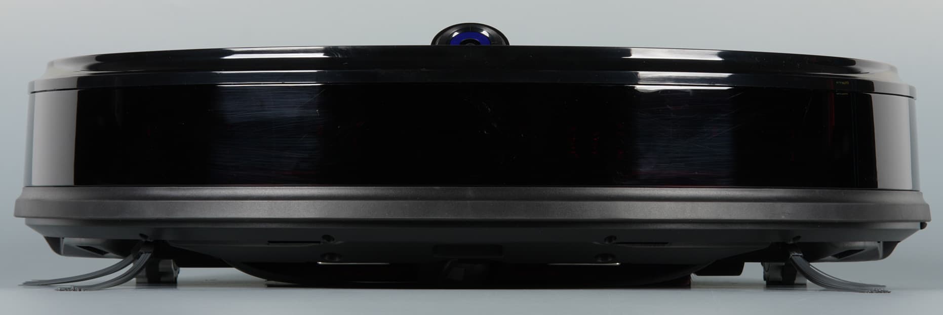 Края сзади снизу скошены, что помогает роботу преодолевать препятствия, а выраженная угловатость при переходе от верхней панели к боковой поверхности снижает вероятность того, что пылесос будет застревать под препятствиями с небольшим просветом.