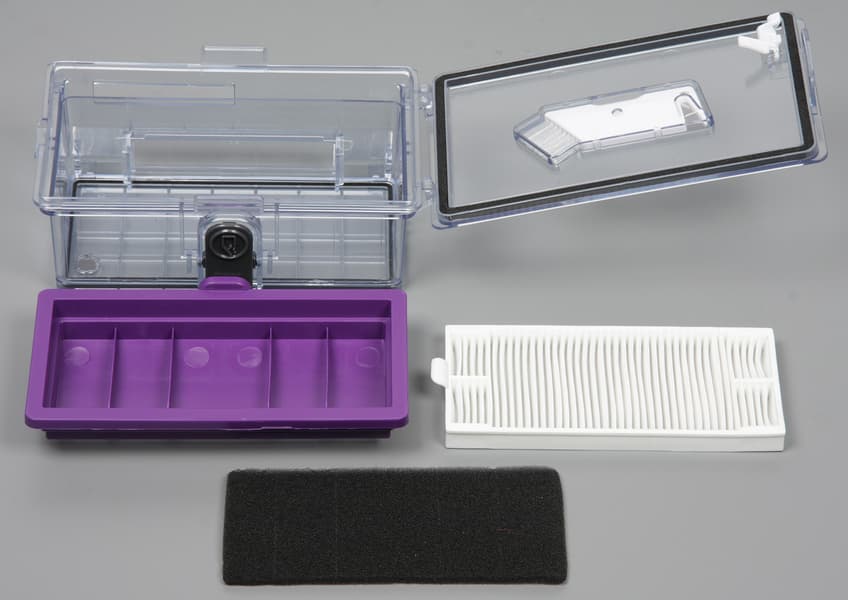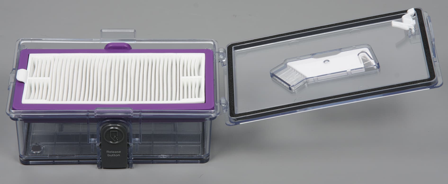 Фильтры удобно чистить с помощью обычного пылесоса с щелевой насадкой. Только при этом нужно постараться не засосать и не порвать тонкий поролоновый фильтр. Отметим, что в пылесборнике нет вентилятора, поэтому сам пылесборник и фильтры можно мыть под водой, главное до установки на место все хорошо высушить. Но промывать складчатый фильтр мы все же не рекомендуем, достаточно его выстукивать или чистить пылесосом. Производитель рекомендует чистить фильтры раз в 15-30 дней, а заявленный срок службы фильтров равен 24 месяцам.