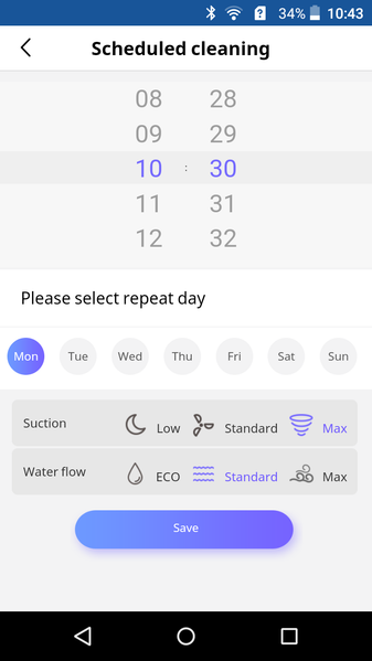 В приложении выбирать режимы уборки, регулировать мощность вентилятора и скорость подачи воды, задавать расписание уборки, отслеживать ресурс щеток и фильтра и статистику уборок, настраивать голосовое оповещение. Также приложение можно использовать в качестве пульта ДУ для управления движением робота.