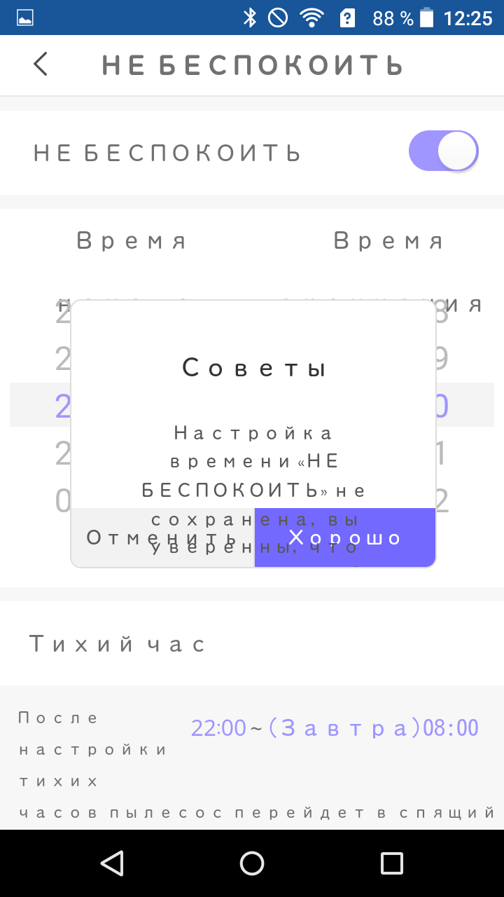 В дополнении к индикаторам о своем состоянии робот сообщает голосом, проговаривая предложения на русском языке. В приложении для смартфона можно установить громкость голосового оповещения, отключить его совсем или установить интервал времени суток, когда роботу лучше помолчать. Там же выбирается язык, на котором робот будет общаться с пользователем.