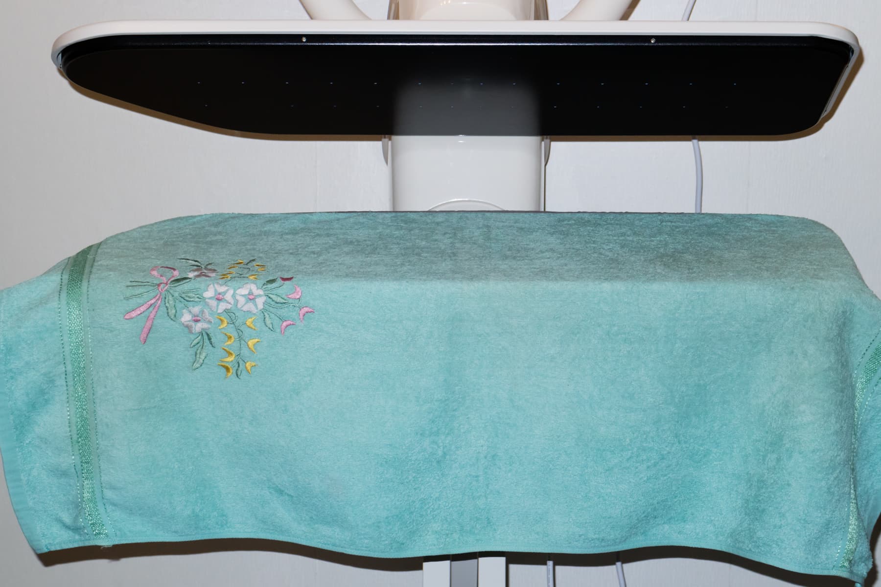 Собственно, никаких проблем не возникло ни с вышивкой, ни с узором у края полотенца. Разглаживали, уложив вещь в один слой. Режим температуры и подачи пара остались такими же, как в предыдущем тесте.