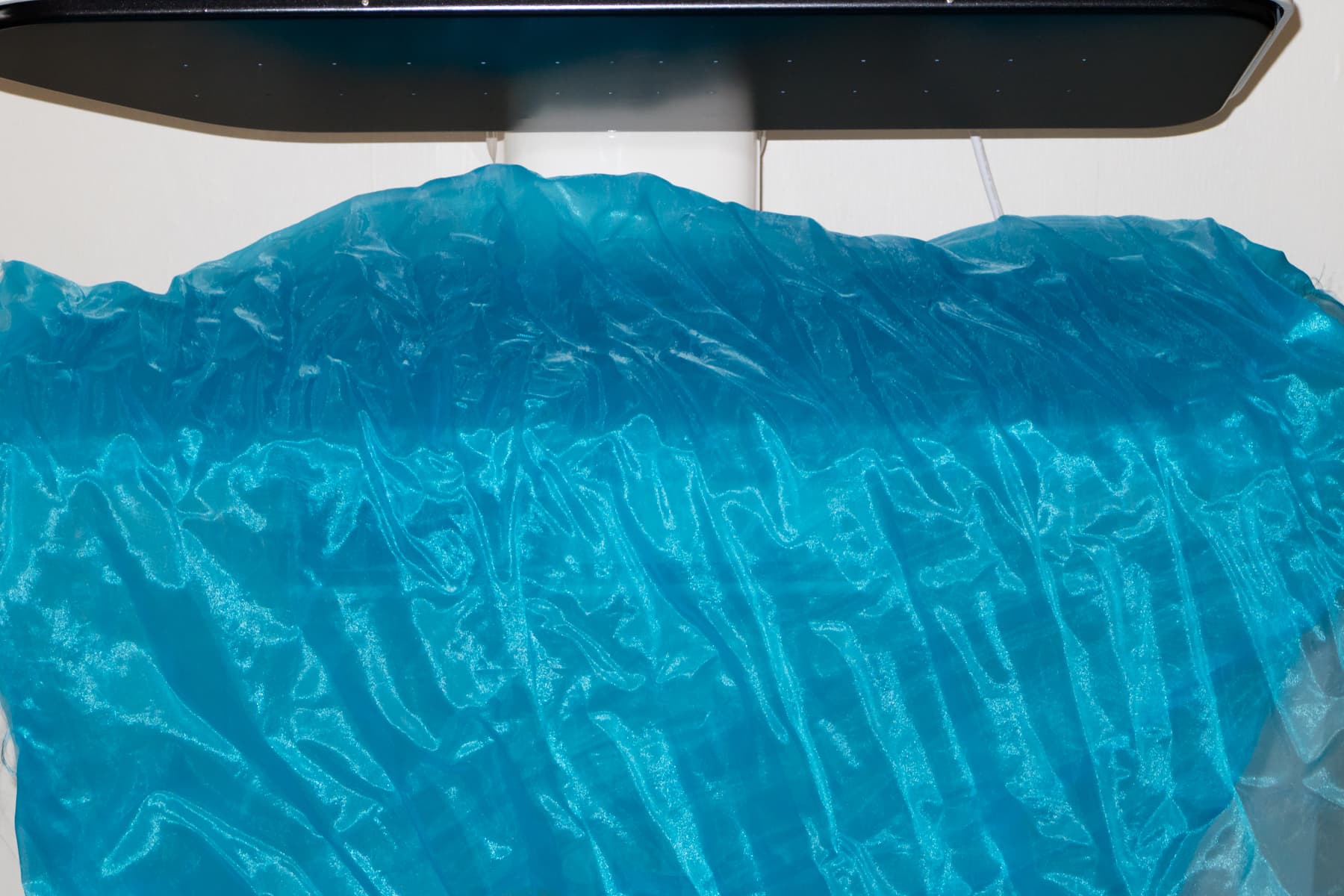Для проверки способности прибора разглаживать синтетические ткани было обработано сильно замятое и пересушенное полотно органзы.